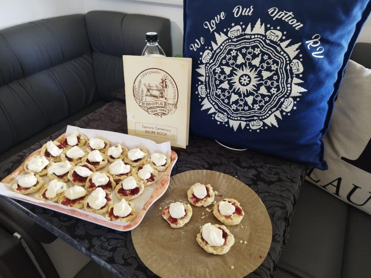To show me what she meant, Kerry cooked a stunning batch of scones, loaded them with jam and cream and invited us for morning tea. The recipe she used was from a cookbook she was given when her family moved to Temora, NSW. This book was put together before the world of Air Fryers had arrived. I took her lesson and information and got my air fryer oven out and had a go. The meal was pork chops, potatoes, tomato, mushrooms and beans. The beans went into the microwave – they don’t need much time to cook to our taste.