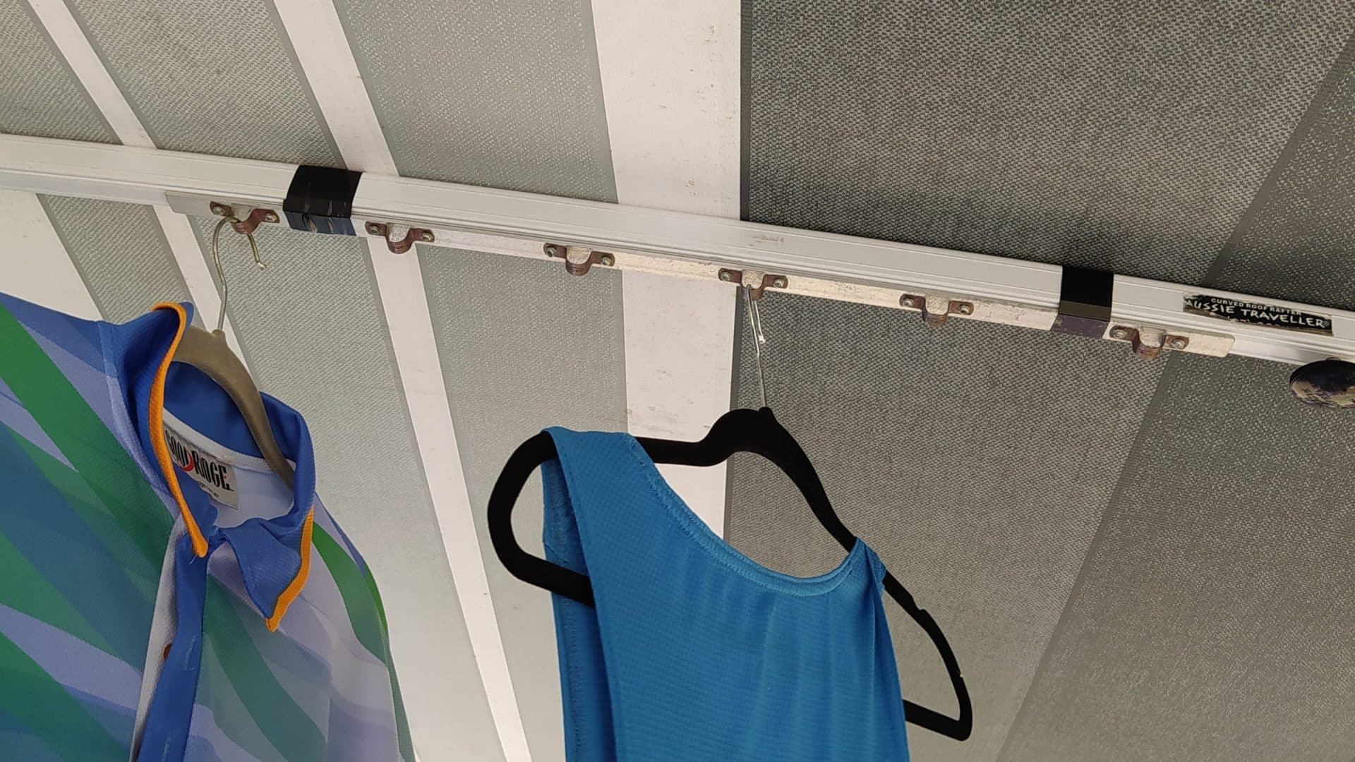 Using a coat hanger saves a lot of room on a washing line, but finding somewhere to hang it without putting a physical line up isn’t easy. This idea is so simple it makes you wonder why you didn’t think of it yourself. Attach hooks to a removable metal strip, duct tape that to a curved awning beam (that will also help with rain run off on the awning), and there you have it. Somewhere to hang your clothes on coat hangers.