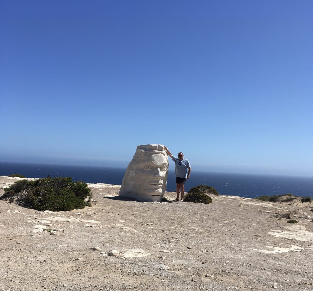 As we have been to Port Lincoln several times, we decided to stick to the smaller places and crossed the peninsula through Cummins to arrive at Elliston, on the western side. This coast changes dramatically. There are still those protected little bays, but here we find the magnificent rocky cliffs of the Great Australian Bight. They form the coastline around to Western Australia. There is a wonderful cliff drive at Elliston featuring amazing sculptures. The roads were not busy, one of the best things about travelling in SA. Once we got to our fishing destination of Venus Bay, we were very glad we had booked ahead. Appropriately, they were packed in like sardines. Many fishers arrive here every year, same spot, and stay for months. They enjoy the whiting, crabs, and squid. We did the same, fresh whiting every night – what a feast. Venus Bay is a small community with a store and many holiday homes. For a night out, Port Kenny pub is about fifteen minutes away and offers a great meal. It was the right spot to celebrate our friend’s birthday.