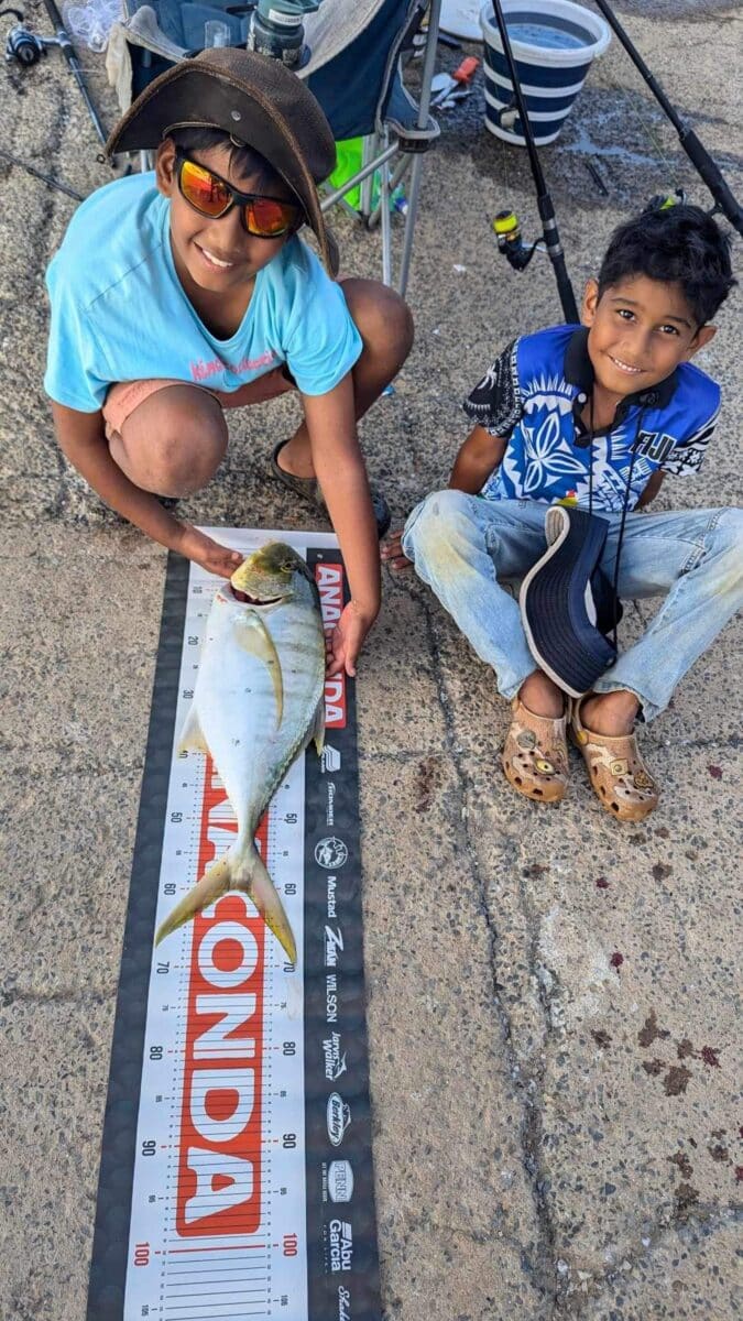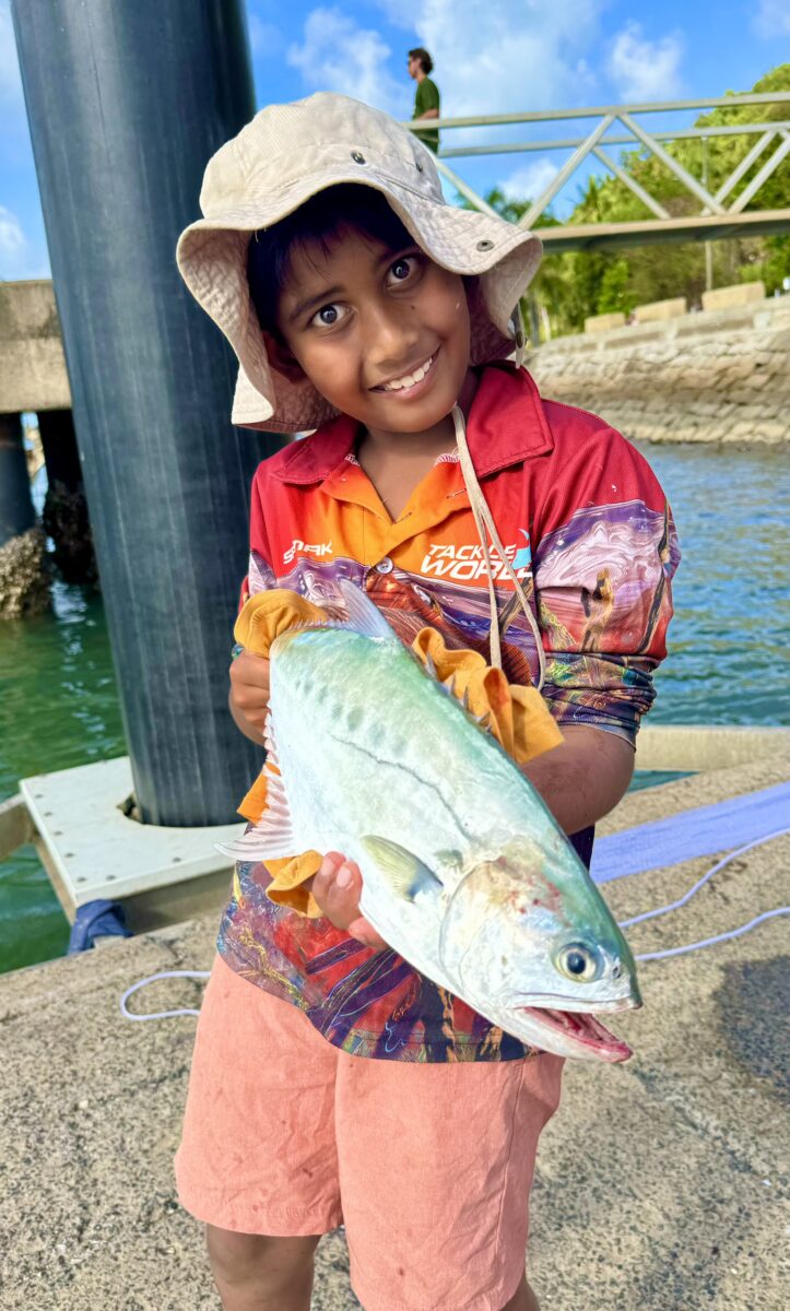 A: The fishing is exciting! The Adventuring Pals caught Golden Trevally, Giant Trevally, Queenfish, Mackerel, and Barracuda all from the wharf.