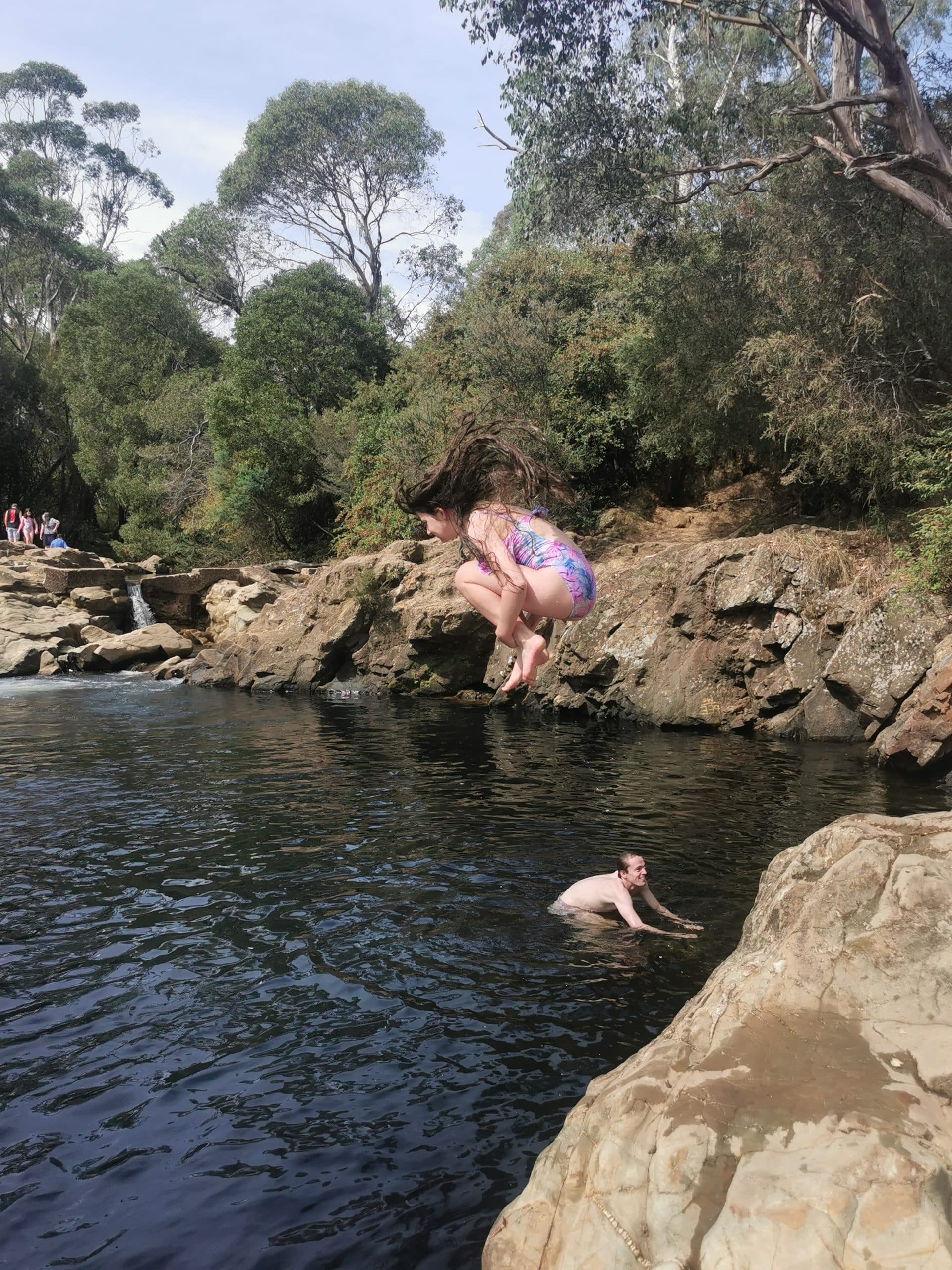 My nephew hired an electric bike in Bright and rode it to our sprawling camp at Bright Porepunkah Holiday Park (formally BIG4 Porepunkah Holiday Park, now a partner park), giving the rest of us a go. We also stopped at Sinclairs Waterhole to scramble rocks to the wide falls. We mastered the rope swing and dangled our legs in the pool carved into the rocks.
