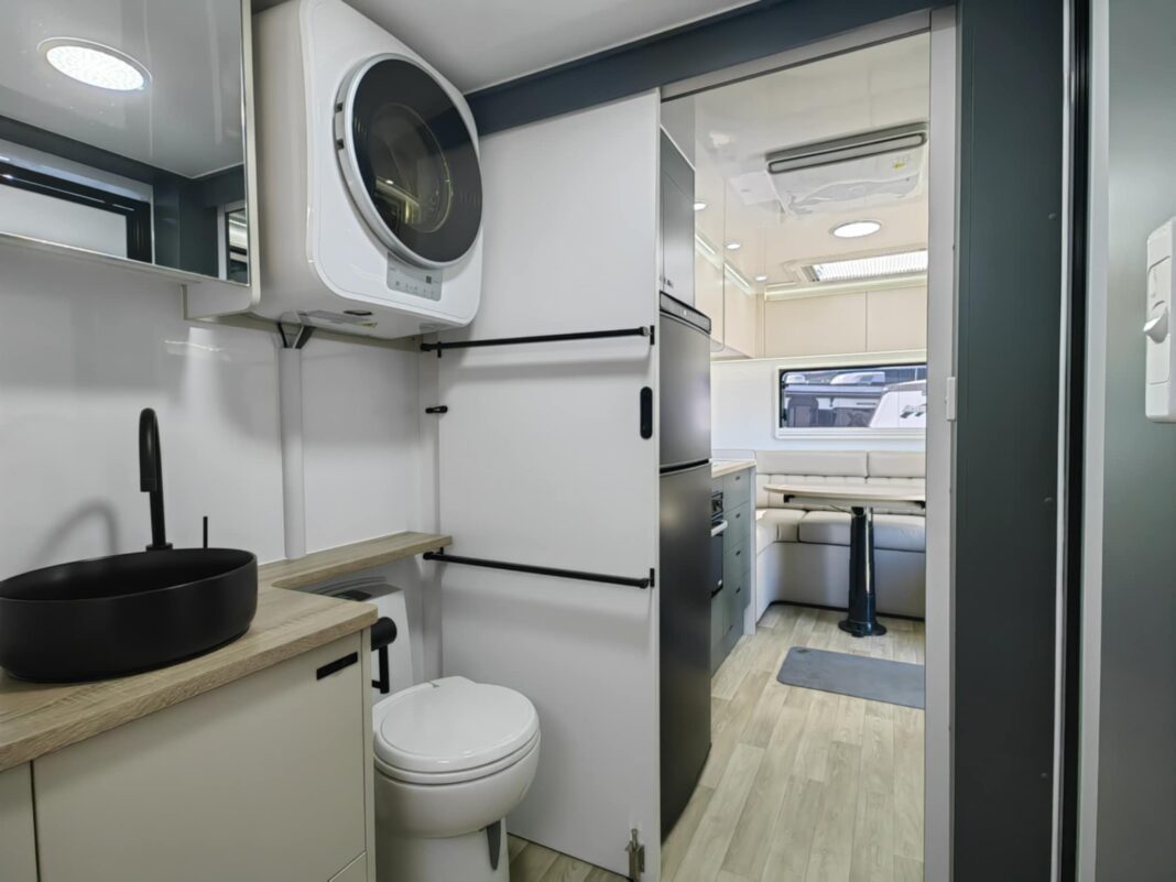 Moving forward, travellers can entirely close off the split ensuite to form a master bedroom. On the far side, we find a powder room with two towel rails with a toilet, and to the left, on the camp side, a deep single shower.