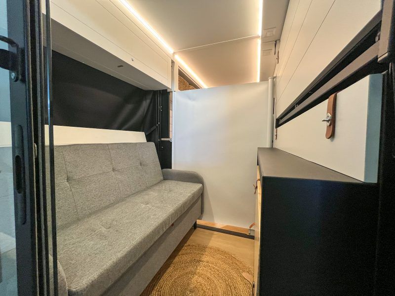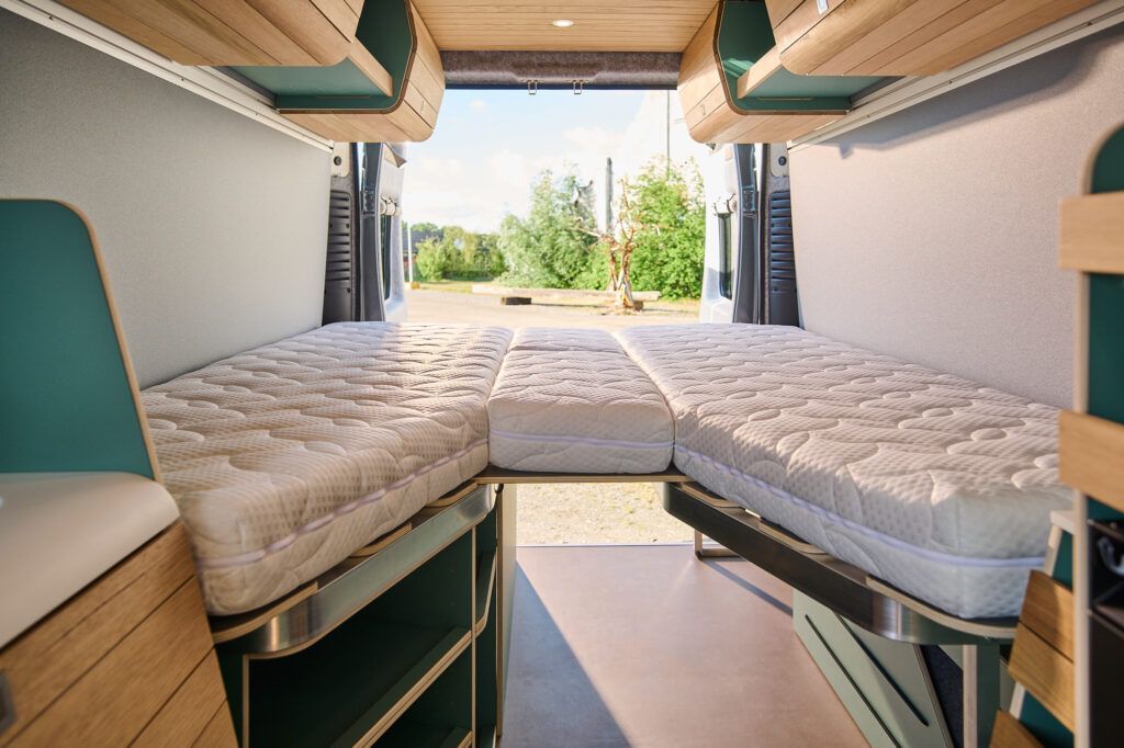 - The System: Two self-contained aluminium “cubes” (Living/Bedroom and Kitchen/Bath) slide into any L2H2 van, such as a Mercedes Sprinter or Fiat Ducato.