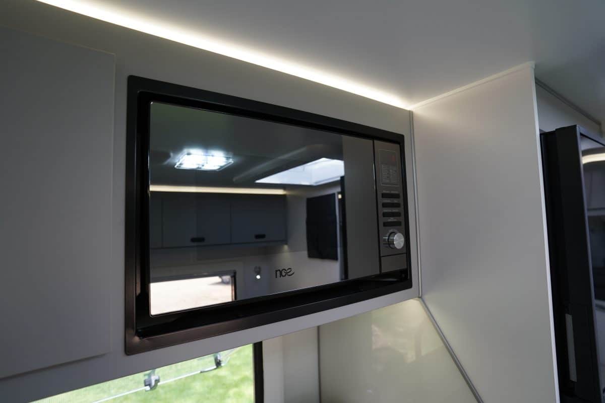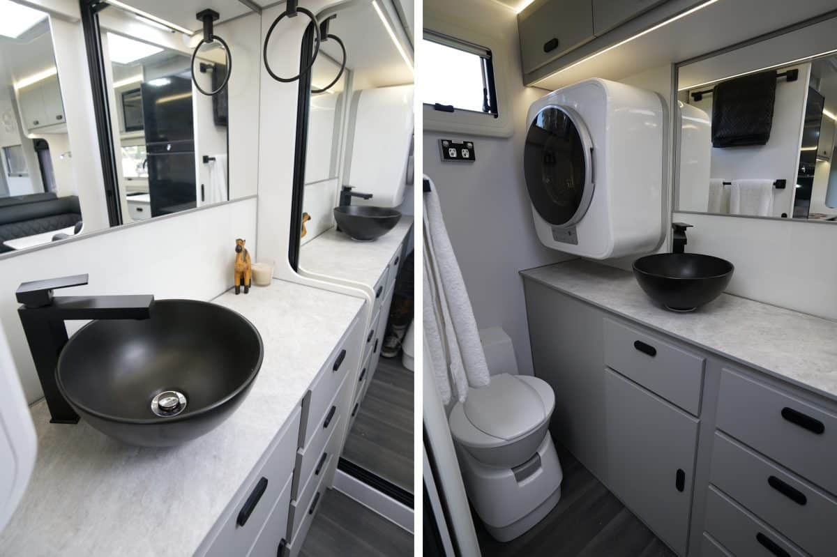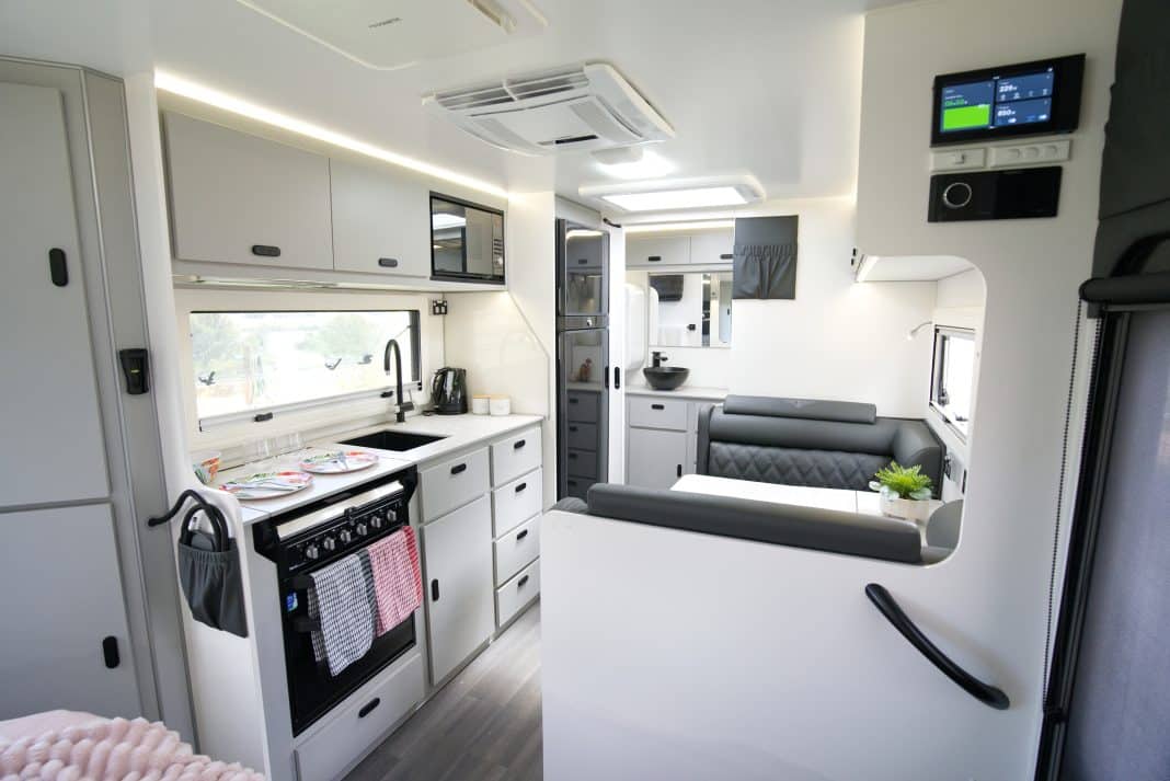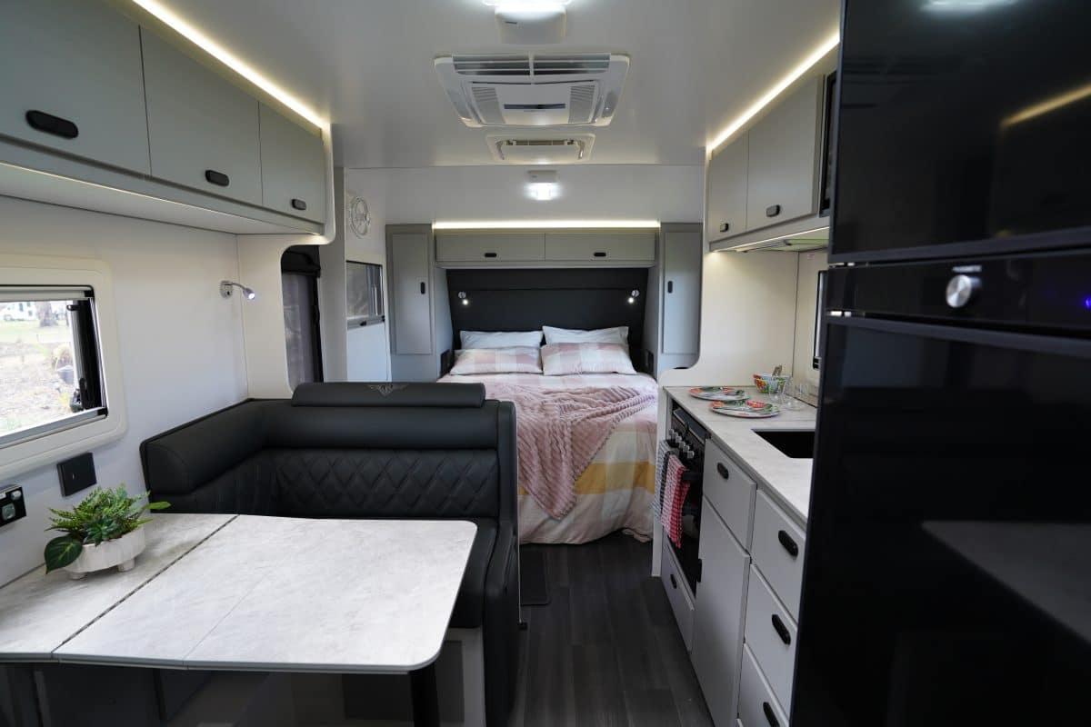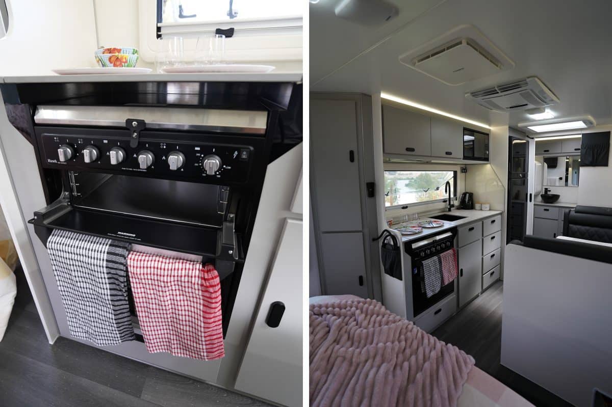 The kitchen setup is practical and attractive, with stone benchtops featuring a heat-resistant thin-skin coating that’s tough enough to withstand hot pots. It also includes a four-hob cooktop, oven and grill, and a Dometic 216L compressor fridge.