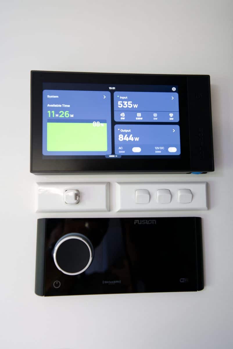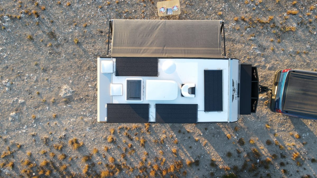 The system is supported here with an 800W solar array, teamed with the 3600W inverter, to run appliances like air-conditioning and the narrow yet deep Dometic 216L compressor fridge off-grid.