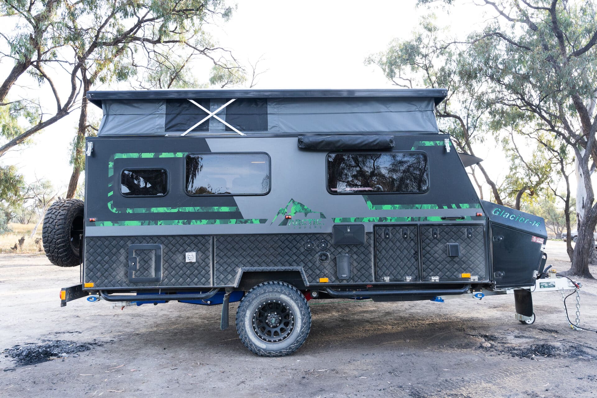 The Arctic Glacier 14 TS is a compact, high-comfort, off-road hybrid pop-top featuring twin single beds, an electric roof, internal and external kitchens, a full-rear bathroom, and a sophisticated Projecta/lithium power system.