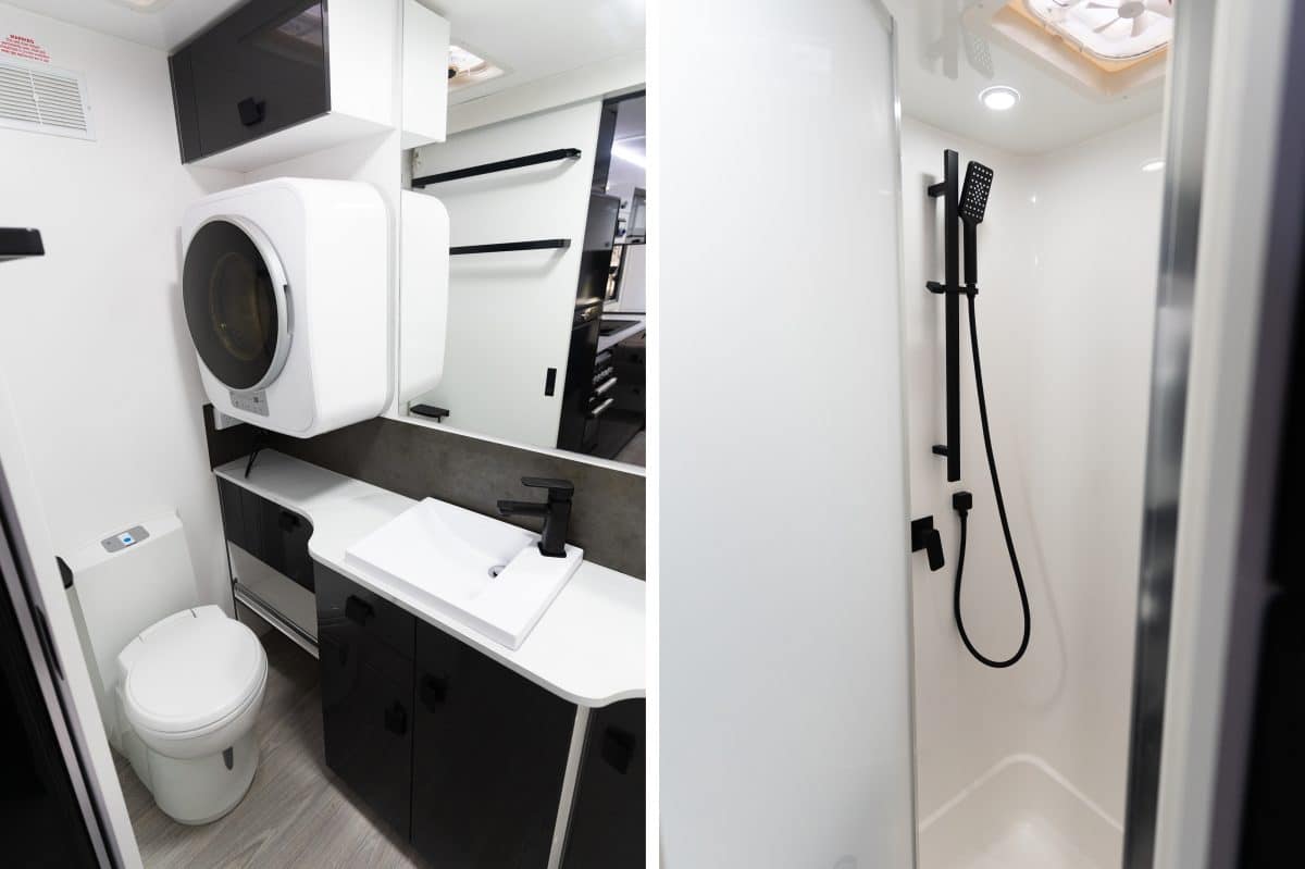 Clever CNC routed countertop optimises the compact bathroom layout providing ample room for the washer, ceramic toilet, shower and large mirrored wall in this smaller size ‘middie’.