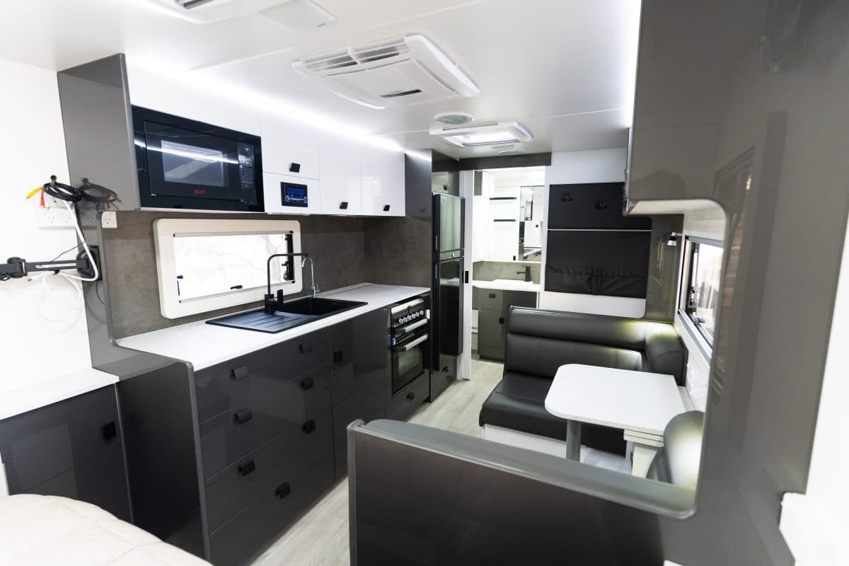 The kitchen setup comprises a full oven, grill, and cooktop, microwave and large Dometic compressor fridge set within fingerprint-resistant 15mm TruMatte double-sided cabinetry.
