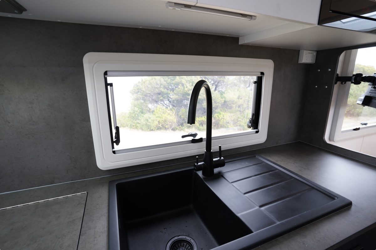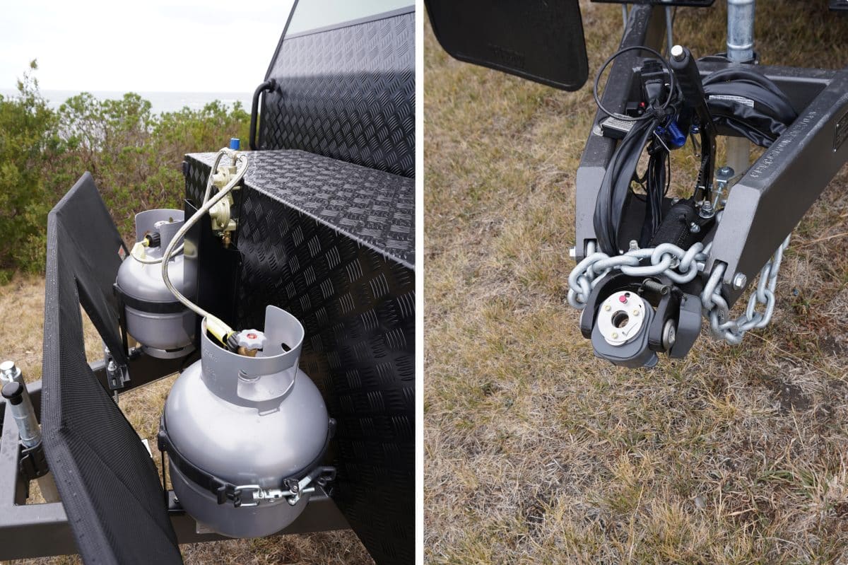 Franklin really cultivated a welcoming space out at camp beneath a well-lit awning alongside a handy fold-out picnic table. There’s ample room for gear too in the checker-plated toolbox just forward of a galvanised toolbox.
