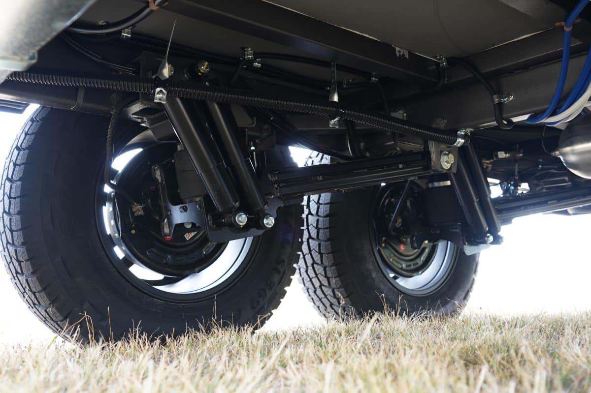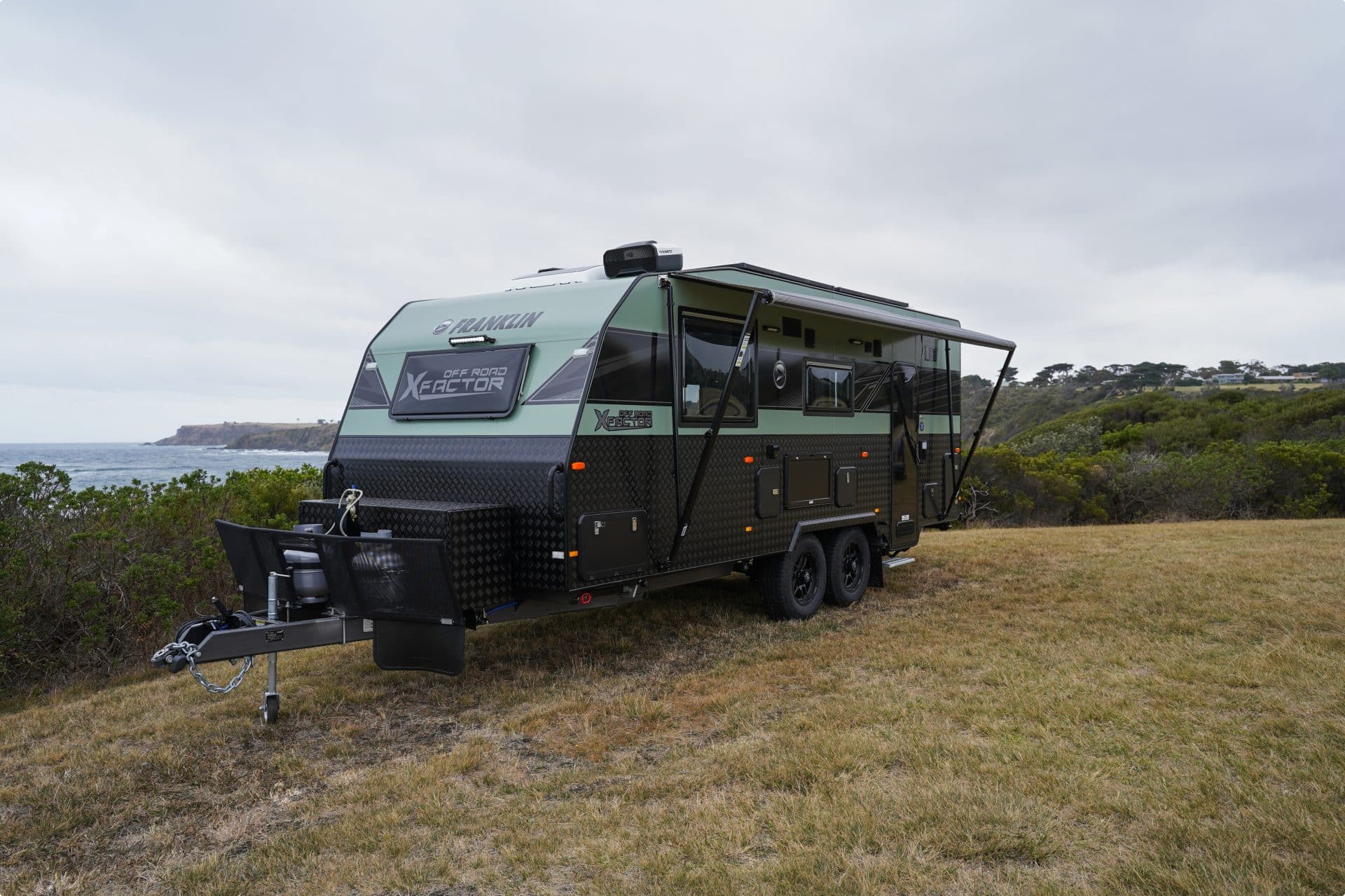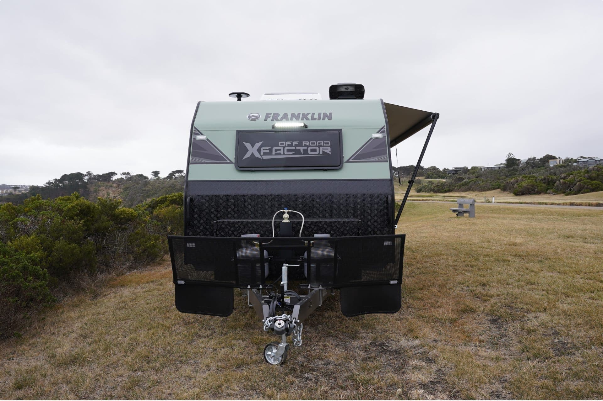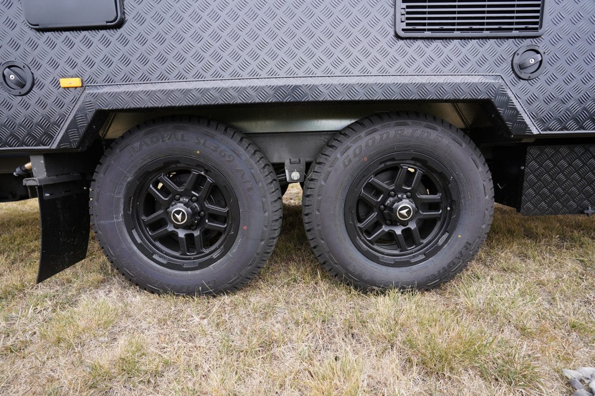 The Franklin Factor X 206 rides on AL-KO Enduro X suspension uses pressed metal control arms tested off-road for strength-to-weight balance. The twin axles are shod with 265 R17 rims and All Terrain Tyres and a DO35 coupling on the nose.