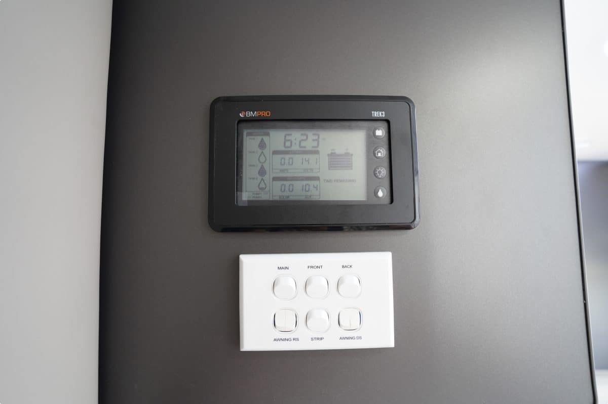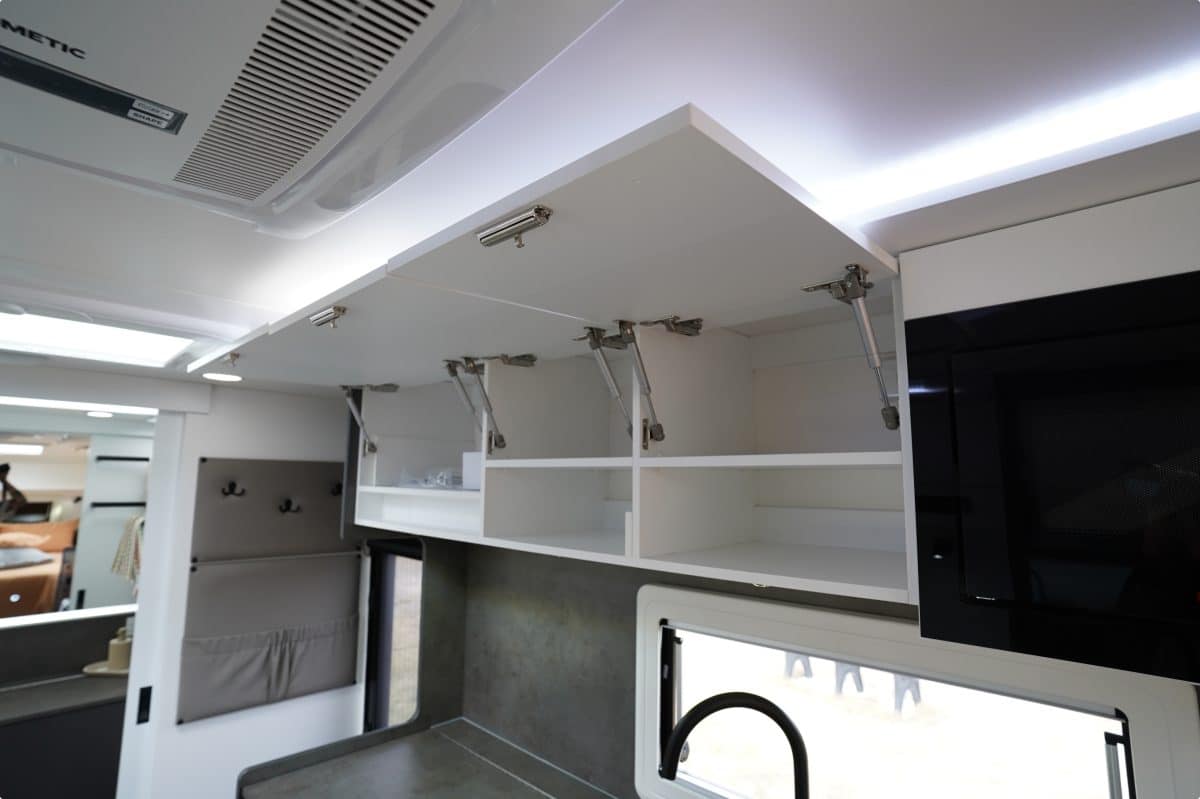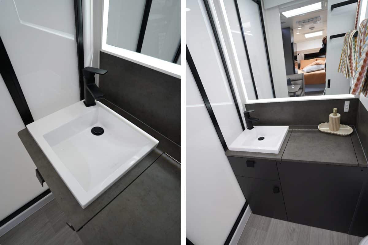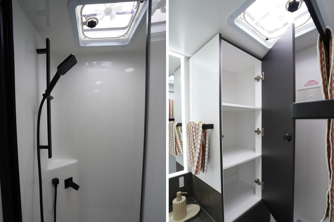 The bathroom layout comprises a large, gorgeous backlit illuminated mirror. Franklin uses Perspex shower door with a full-length magnetic catch to save on weight and installs a waterproof ceiling above the one-piece fibreglass shower-serviced with instantaneous hot water.