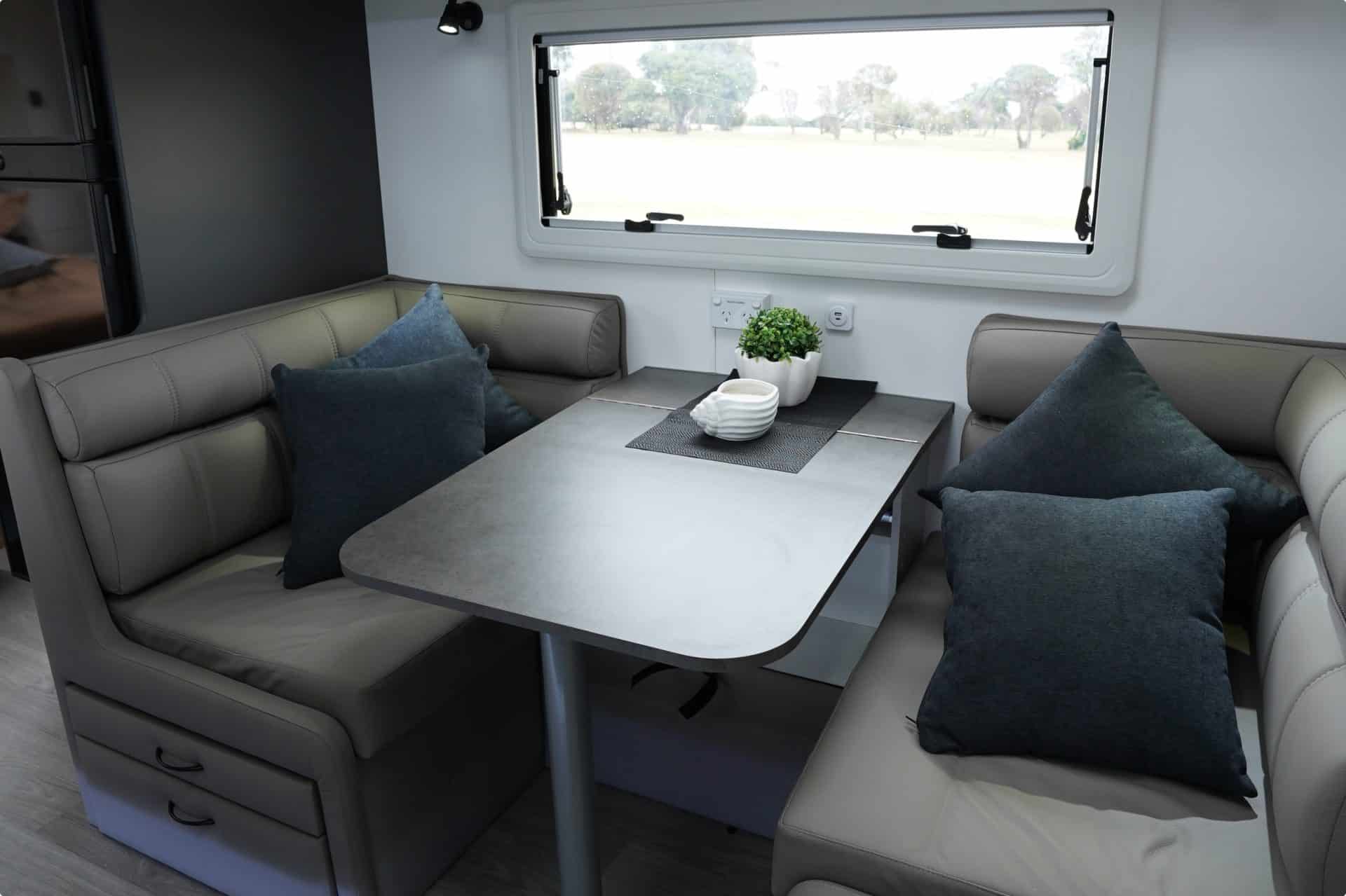 This couples’ rear door design features a mid-ship lounge in a choice of cafe or dinette seating, seen here, forming the heart of the living and dining area. Towards the front, you’ll find a queen-size berth and a full-width ensuite at the rear.