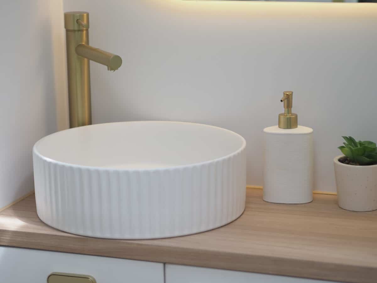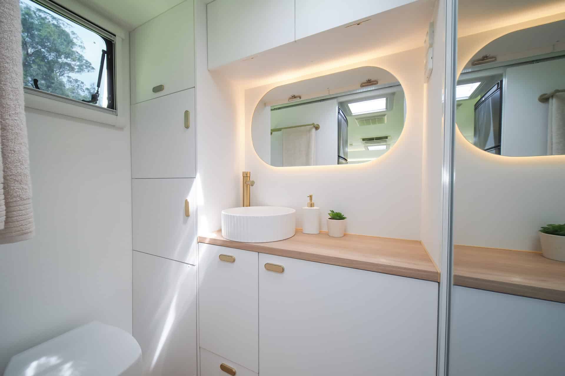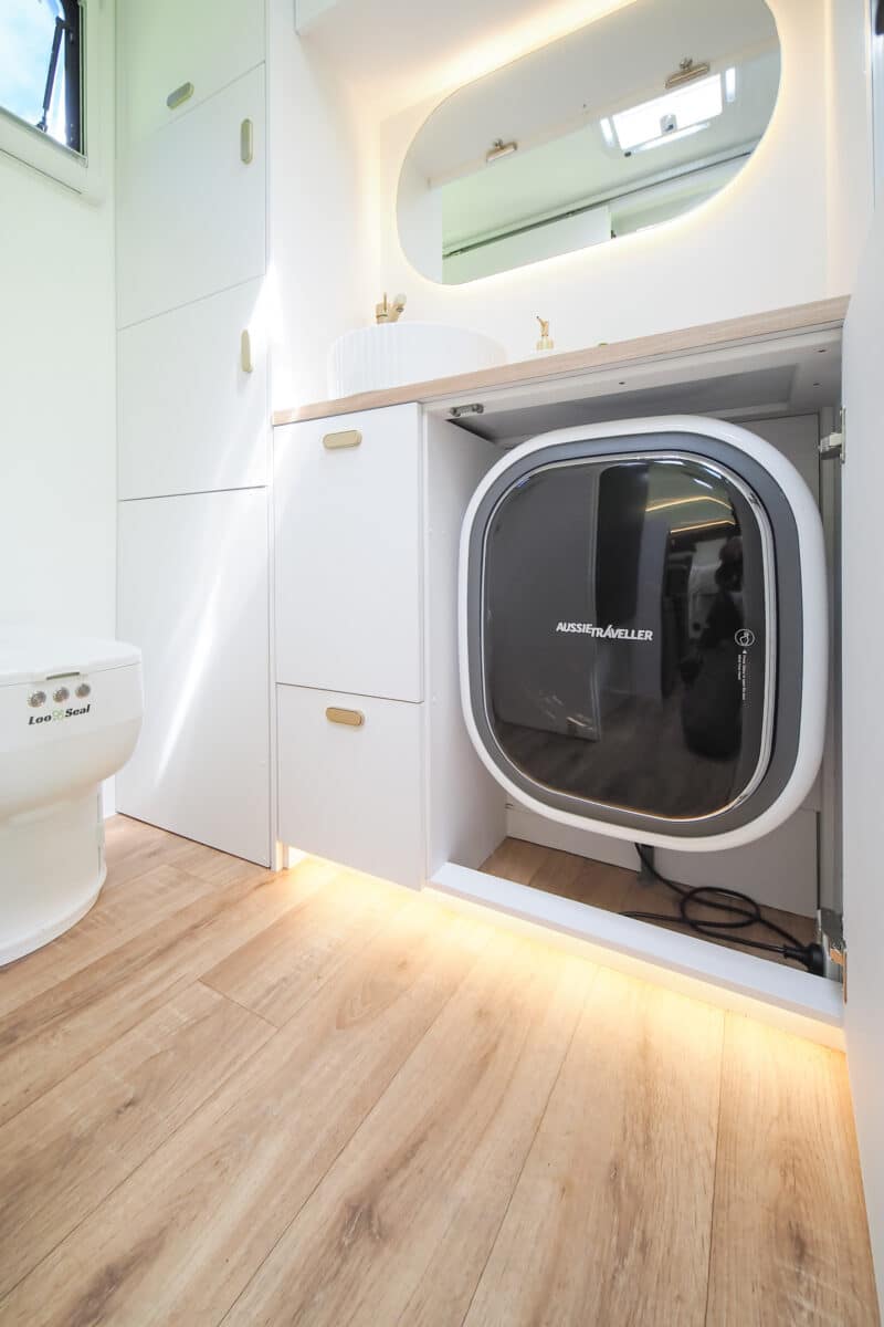 That’s adjacent a wall of cabinetry that conceals the washing machine. It surrounds a backlit circular mirror above the white fluted basin, finished with gold tapware fittings that are found throughout this van.