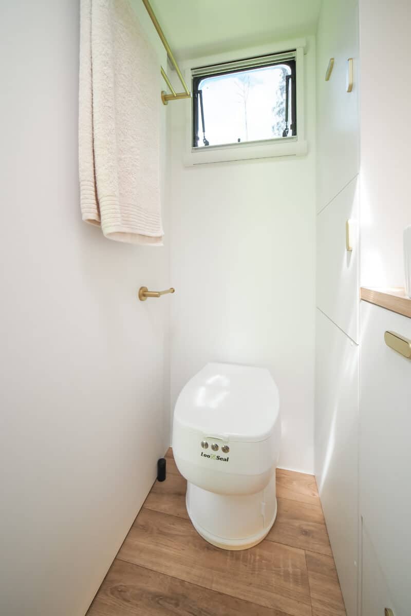 While at the rear, the bathroom layout includes a LooSeal toilet, offering an alternative to composting systems. LooSeal units use bags to seal waste for easier disposal and come with their own battery system.