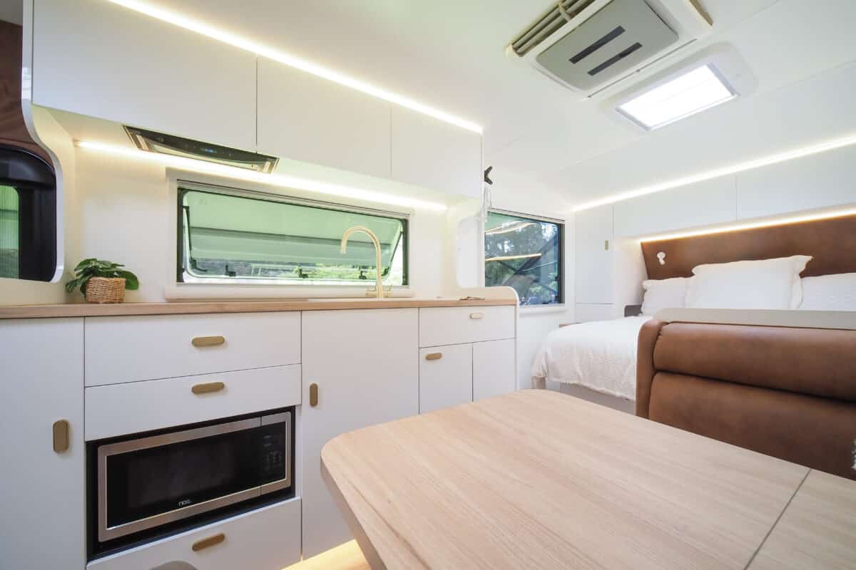 Stepping through the rear door, the unencumbered timber-look bench reveals the kitchen setup‘s off-grid intent, with two portable induction cooktops stored in a slide-out drawer above the inbuilt microwave.