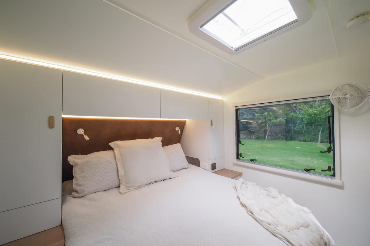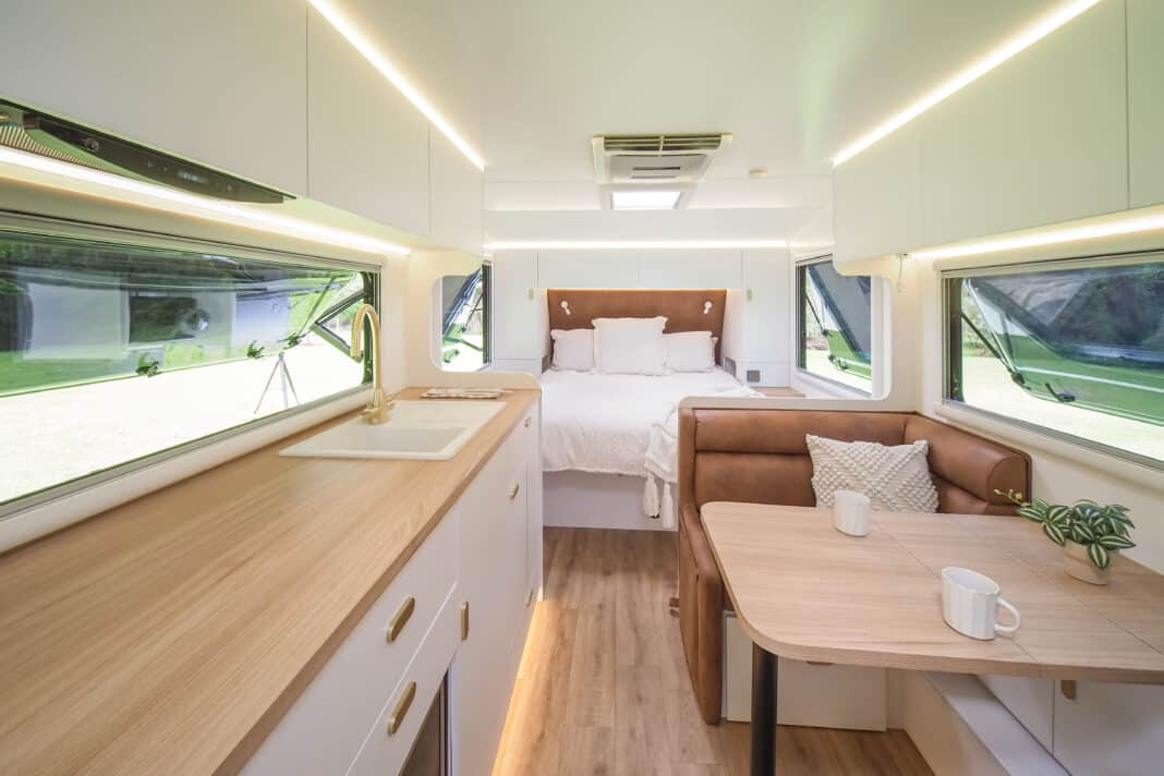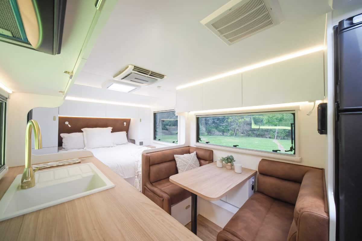 Grand Caravans’ own professional interior designer elevates this space, furnishing it with attractive touches like the flutted basin and matt white ceilings that sensitively reflect modern trends.