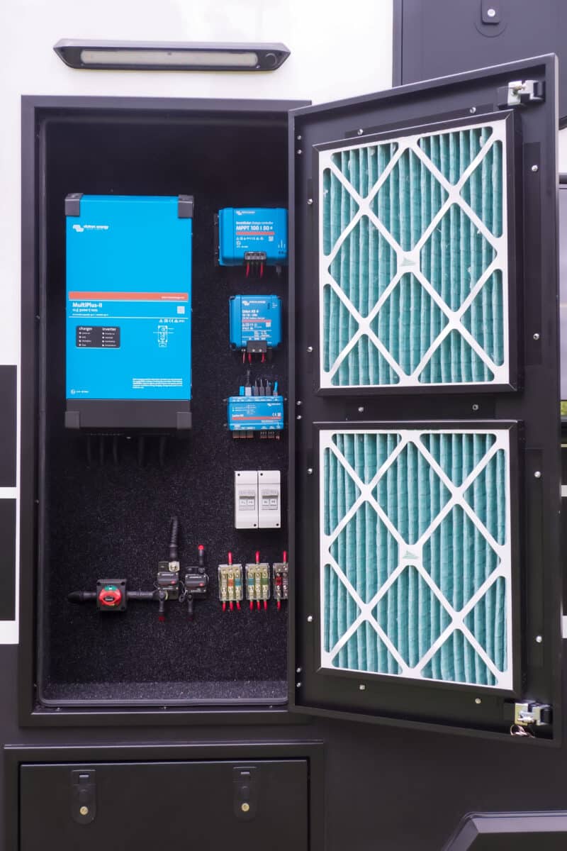 It features a Victron Cerbo GX with GX Touch that lets you control your lights remotely and monitor the Victron Energy Electrical System. That pairs with a Victron Multiplus 3000 Inverter & 120A AC Charger for fast charging off-the-grid.