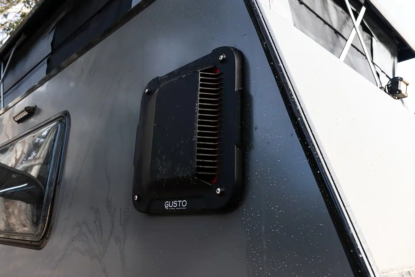 Unlike some dust management systems that mount on the roof, the Gusto DRS installs on either side of the caravan body, leaving roof space available for solar panels and other equipment. The system runs from a 12–14V power supply and is designed to pressurise the van interior in seconds.