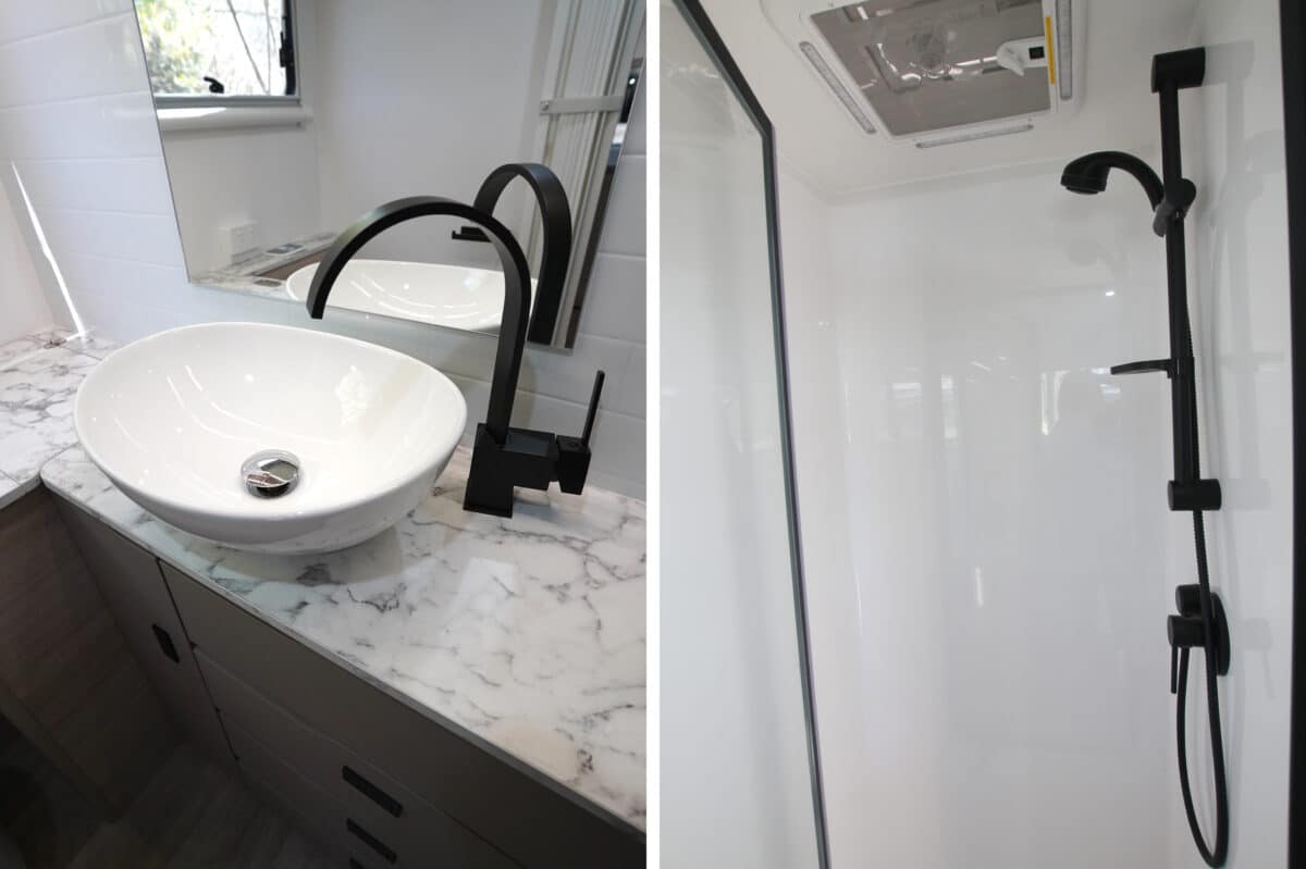 It is a big floorplan at 21ft+ and for that you get a bit of room in the ensuite, which features a tall mirror, black matte tapware, floating box cabinets and partially open shelving.