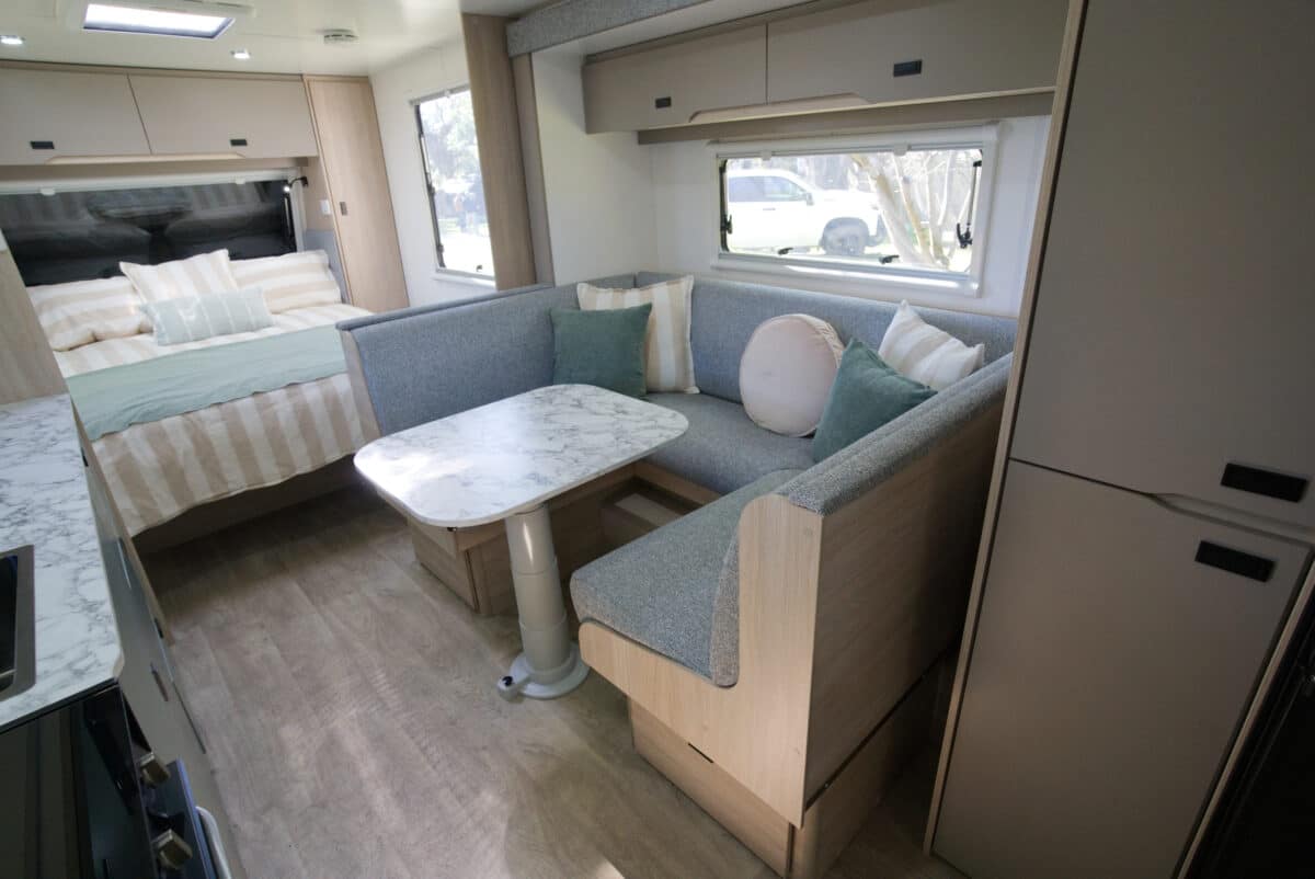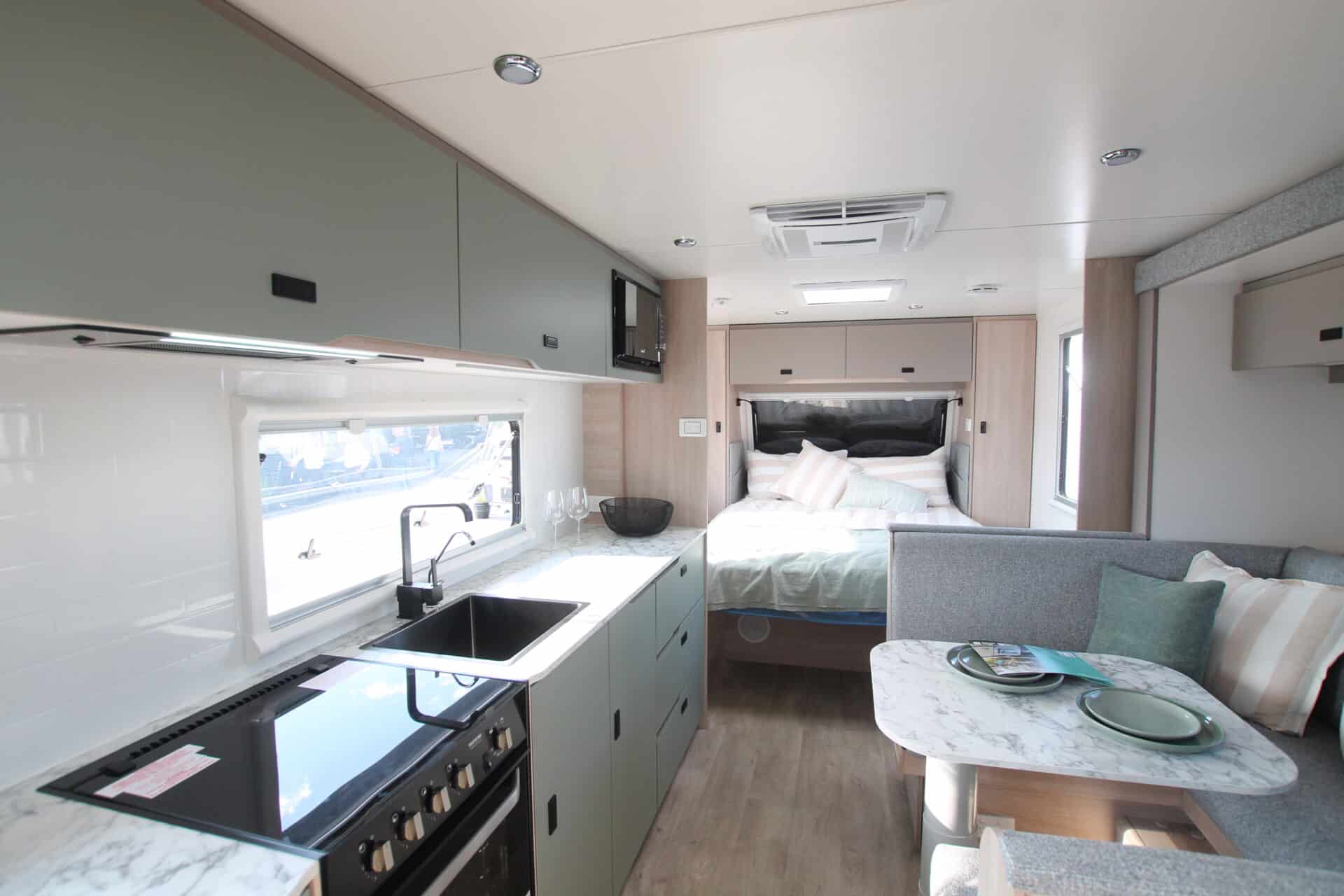 Prices for the Discovery 21.66 OB start from $92,990 with key inclusions like the electric awning, 224L upside-down fridge, air-con and a slide-out club lounge boosting living space in the dining area and the kitchen.