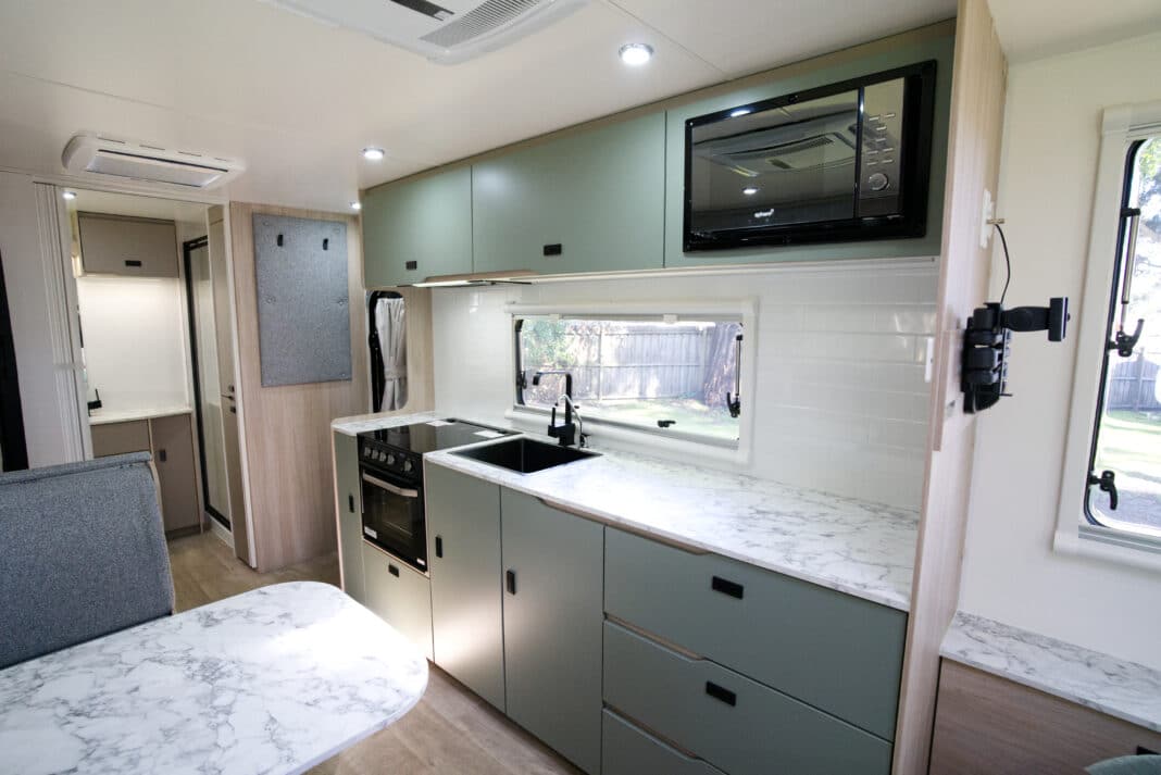 The kitchen, benefitting from that slide-out club lounge, enjoys ample benchtop space with a deep square sink for washing up.