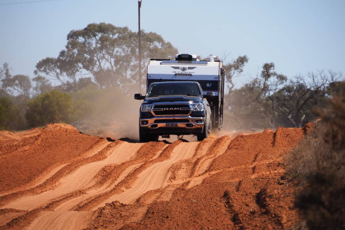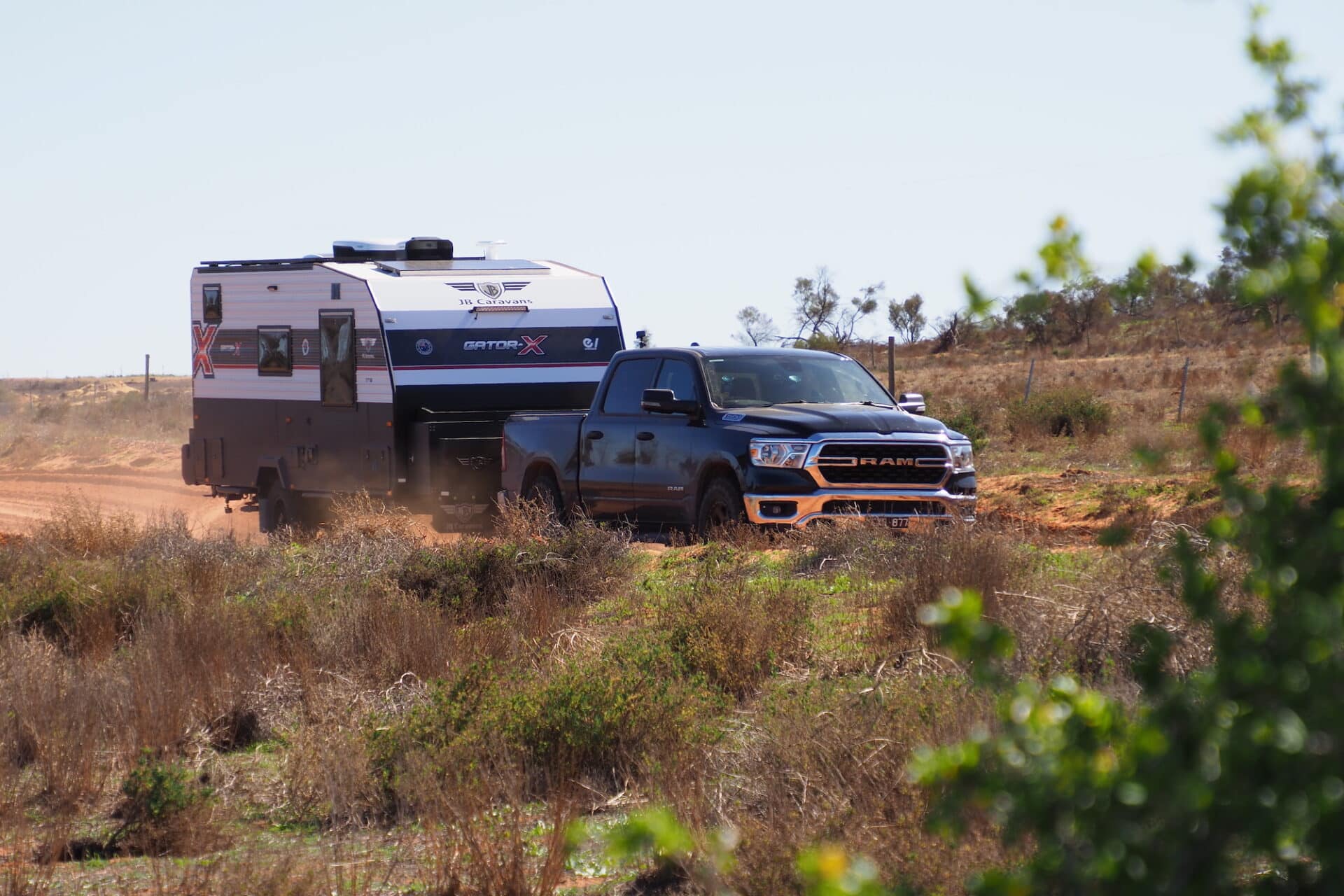 This controlled speed prevents the van from bouncing uncontrollably, letting the Cruisemaster ATX suspension absorb the severe undulations while the coupling rotates to keep the caravan wheels grounded on the shifting surface.