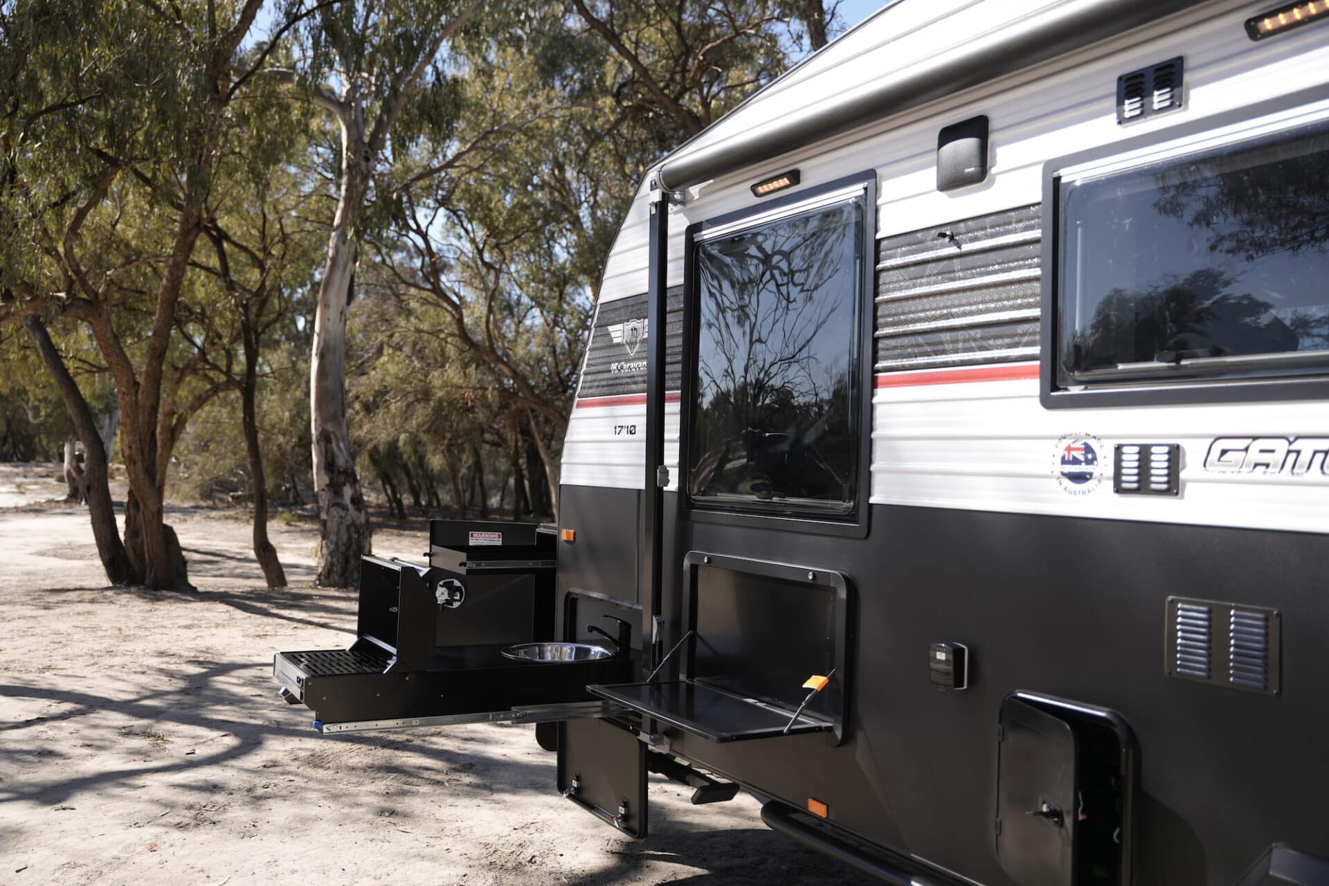 Next to that, a slide-out kitchen featuring an electric barbecue is well served by the nifty, neighbouring fold down picnic table.