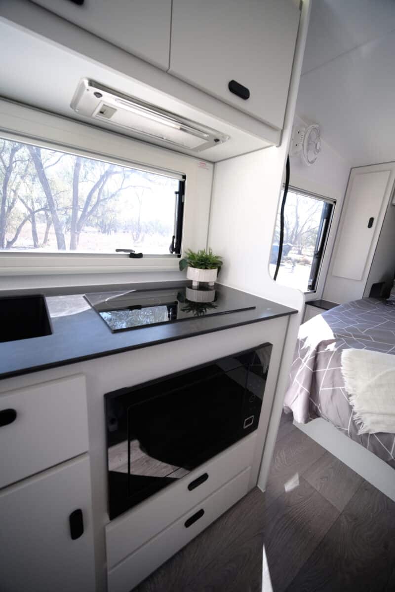 On entry, opposite that generous L-shape lounge, you’ll find the campsite-facing galley kitchen. Pleasant, functional and easy to clean, it features a large sunken sink and two-hob Dometic induction cooktop set with heat-proof countertops.