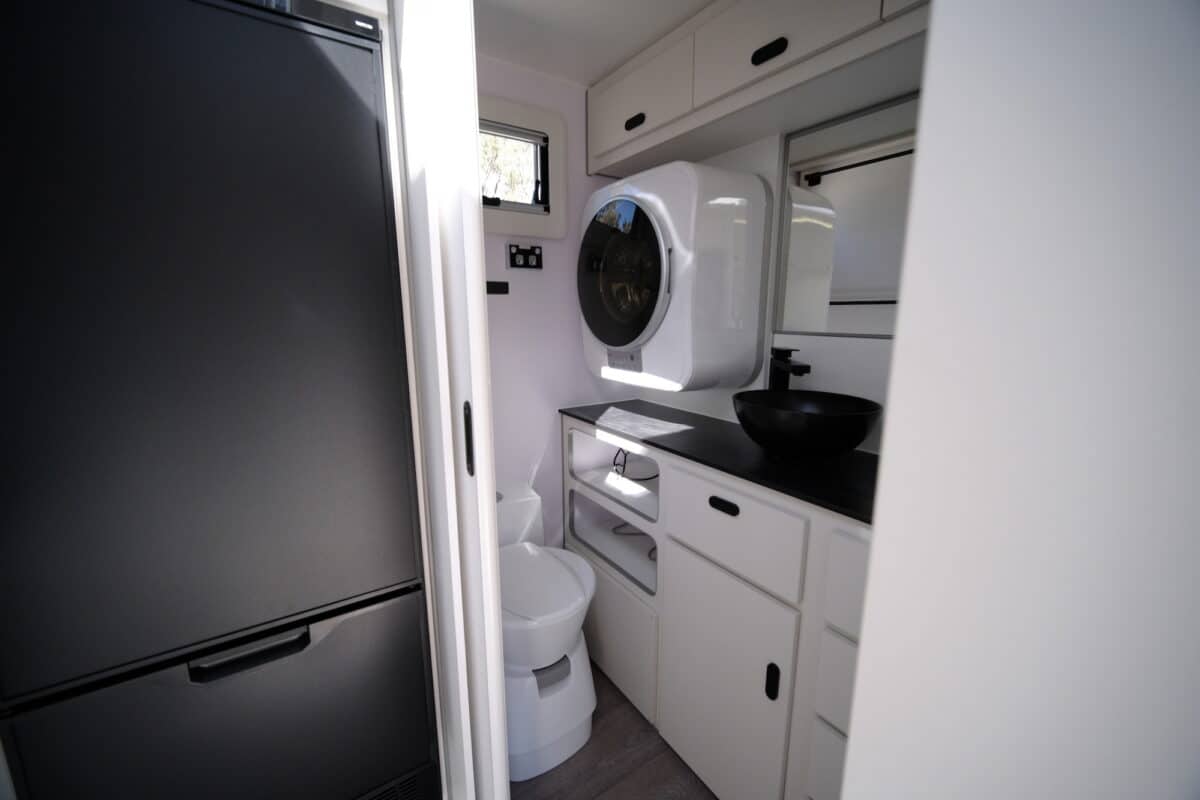 To the right, campers enjoy easy access to the full rear-width bathroom from indoors and out, which includes a front loader washing machine, open shelving and a large shower with on a rail.