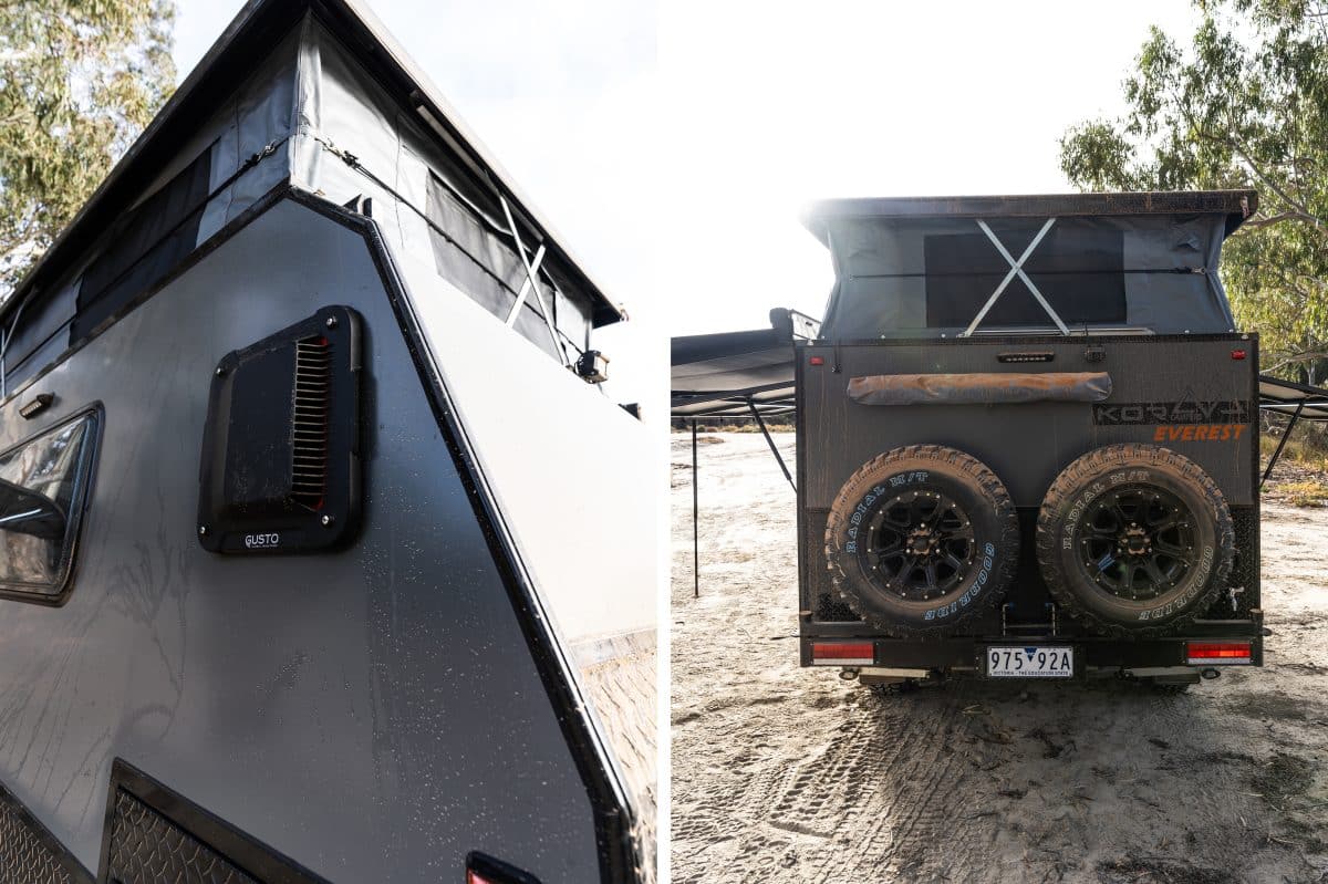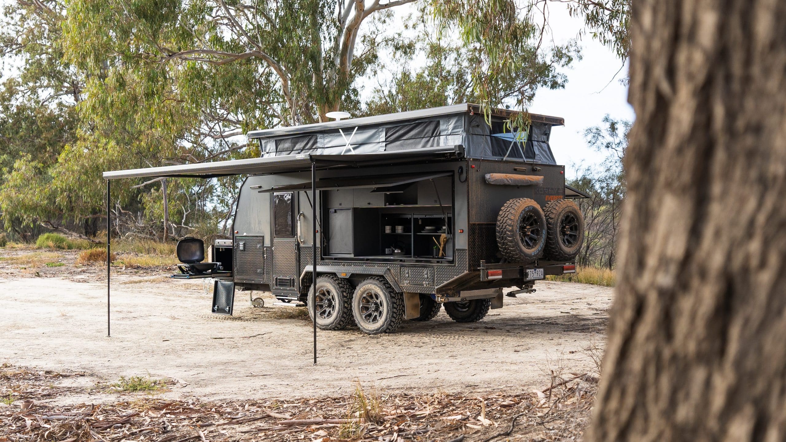 Slide-outs provide access to a barbecue and a fridge. While an external ensuite tent fixed at the rear, away from the entry, forms the bathroom layout plumbed to Truma rapid hot water and twin 120L freshwater tanks.