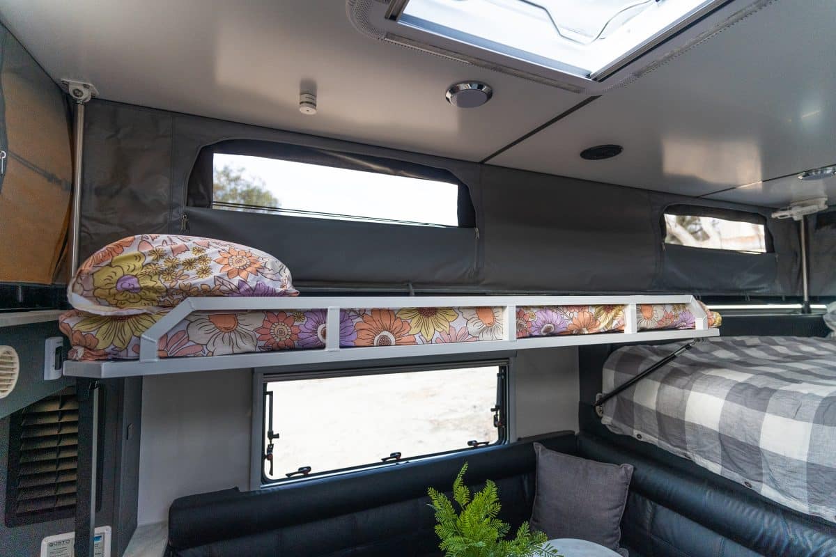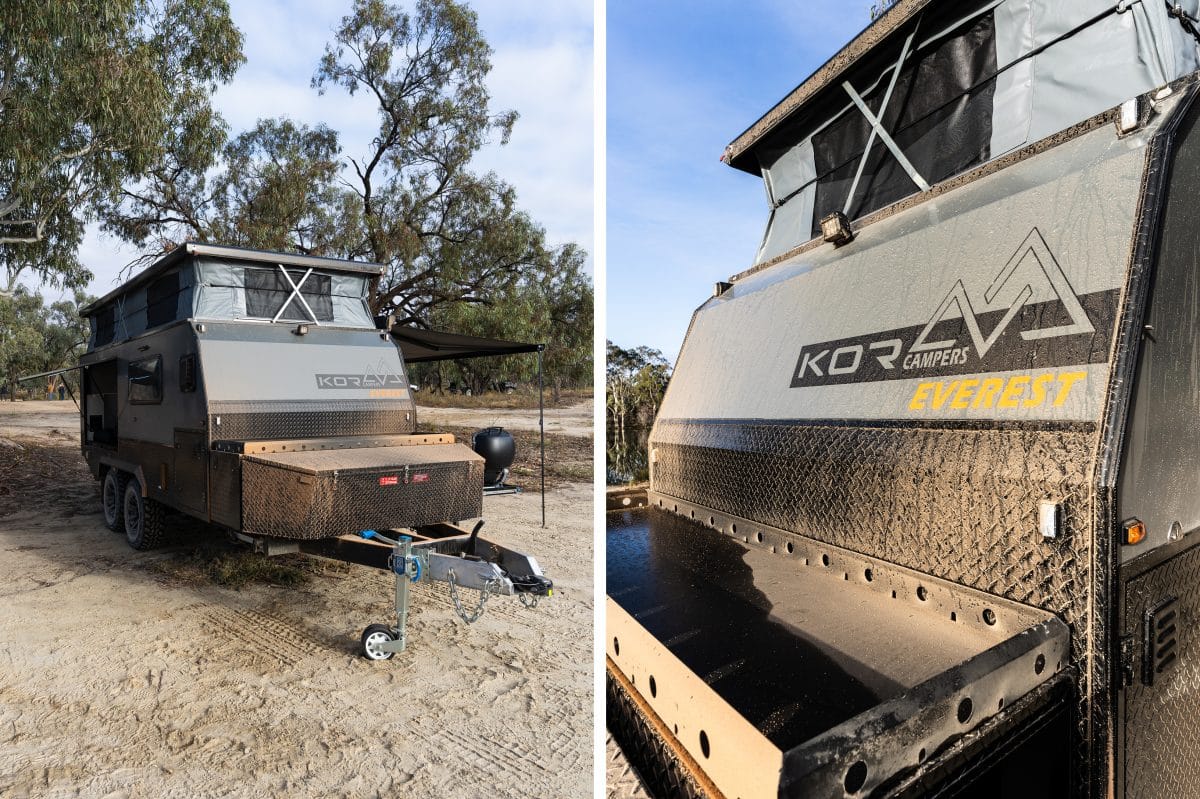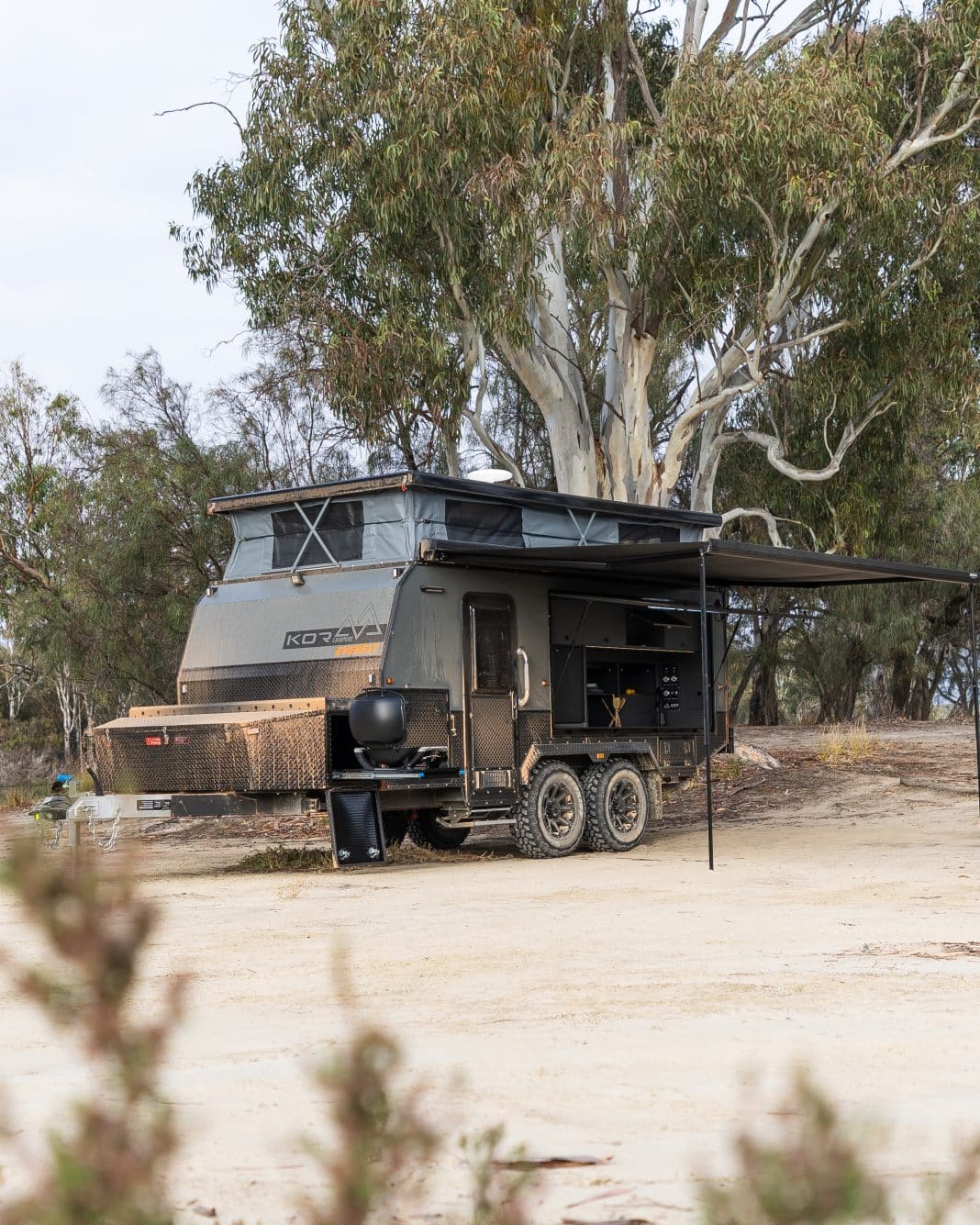 The compact, off-road KOR Everest hybrid caravan suits adventurers who prioritise manoeuvrability and comfort, with an electrically operated roof hastening setup and minimising drag on tighter tracks on the way to camp.