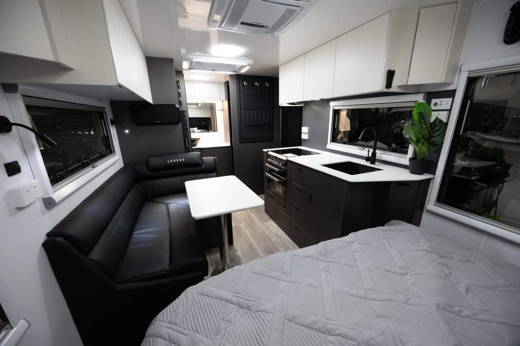 A rear door configuration, the Legend Trackline features an L-shaped lounge forming the living and dining area and kitchen setup mid-ship. It has a north-south bed for the sleeping configuration at the front, and a full-width ensuite making up the bathroom layout at the rear.
