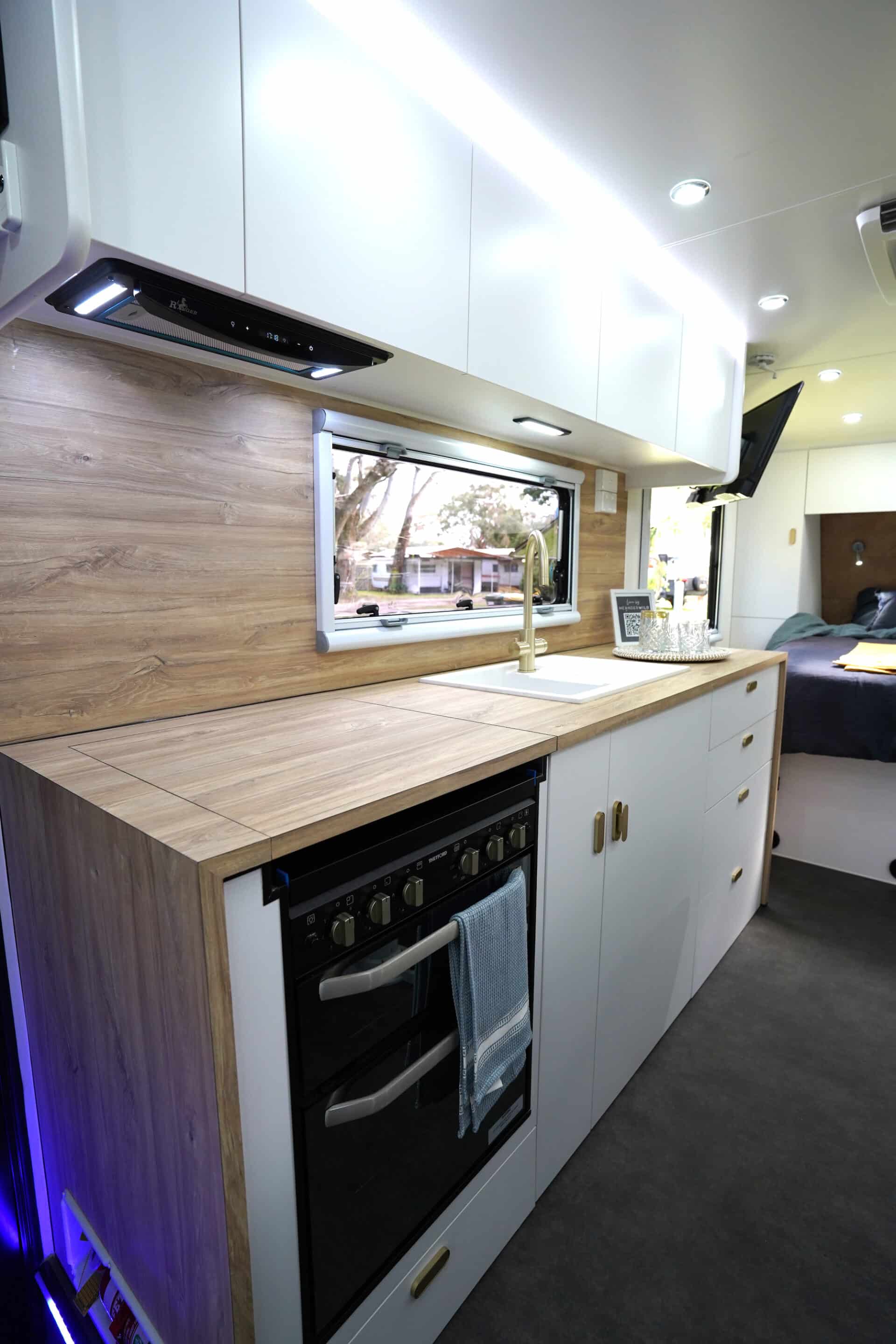 Outdoors, beneath the roll-out awning, Momentum fits toggled amber lighting helping you avoid the mozzies when you’re cooking outdoors.