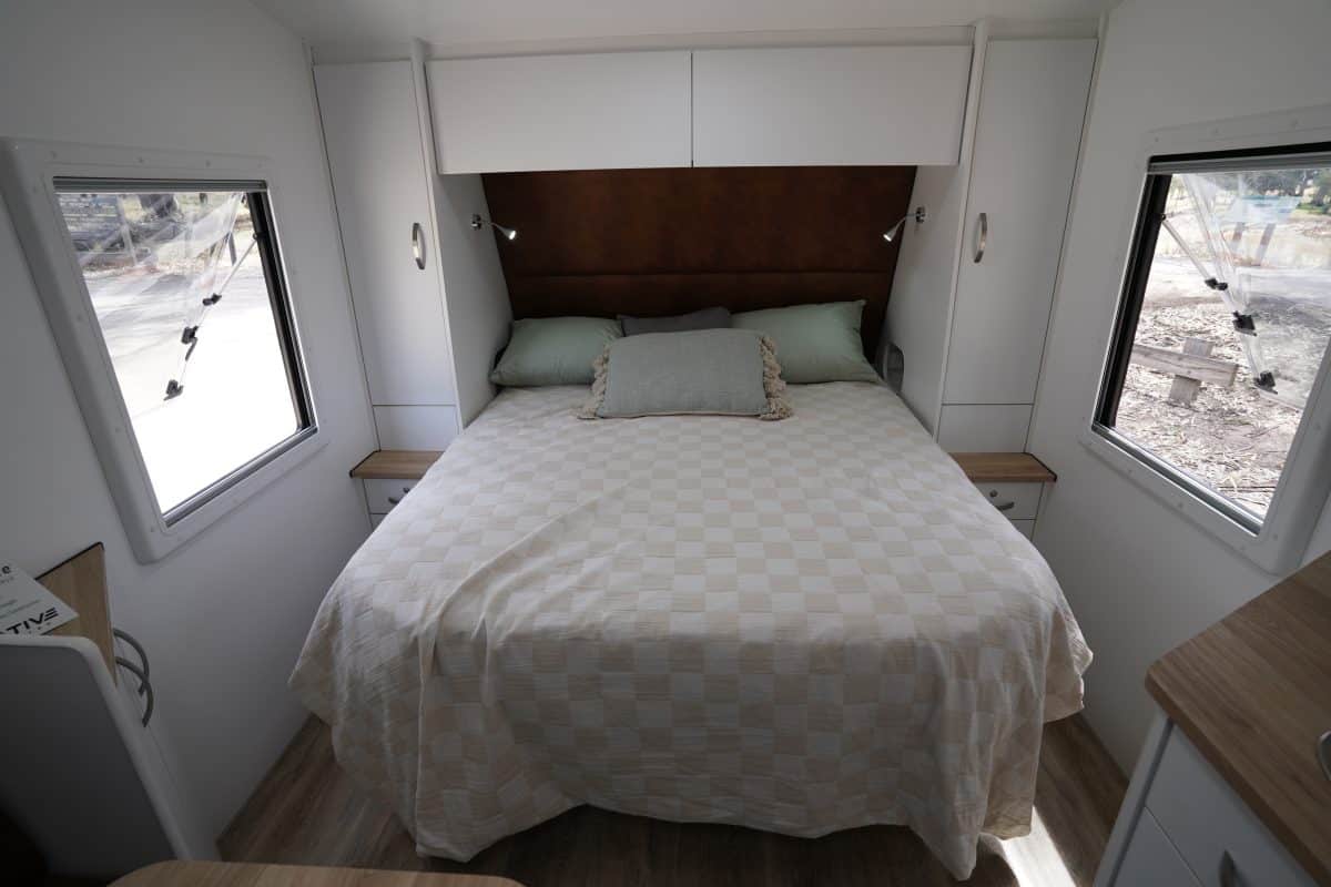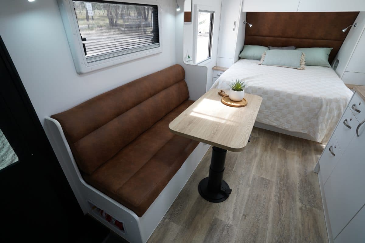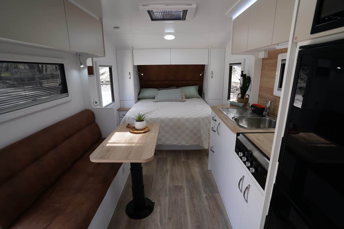 A rear-entry design, the Nova Revivor 544 features a full-width ensuite at the rear, a kitchen galley opposite a central dinette and an east-west bed flanked by wardrobes towards the front.