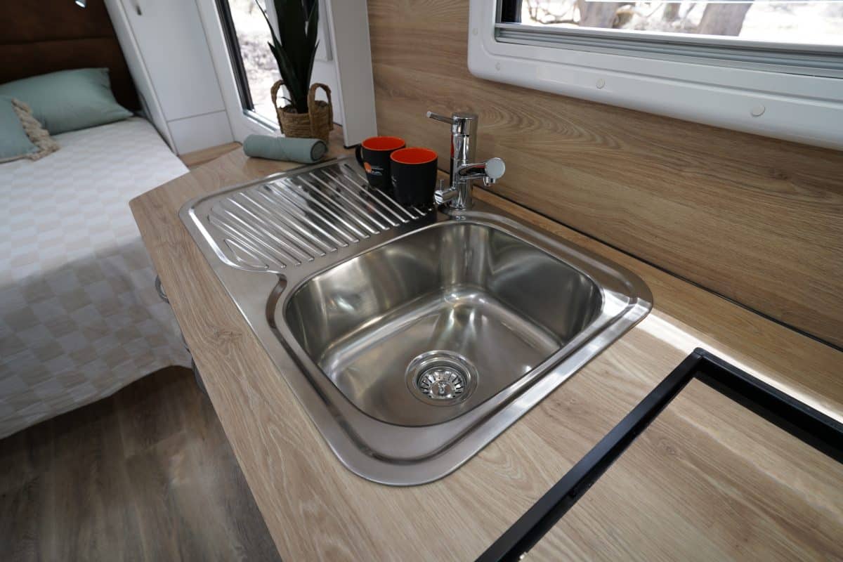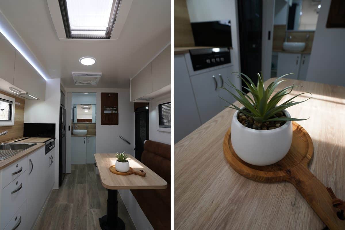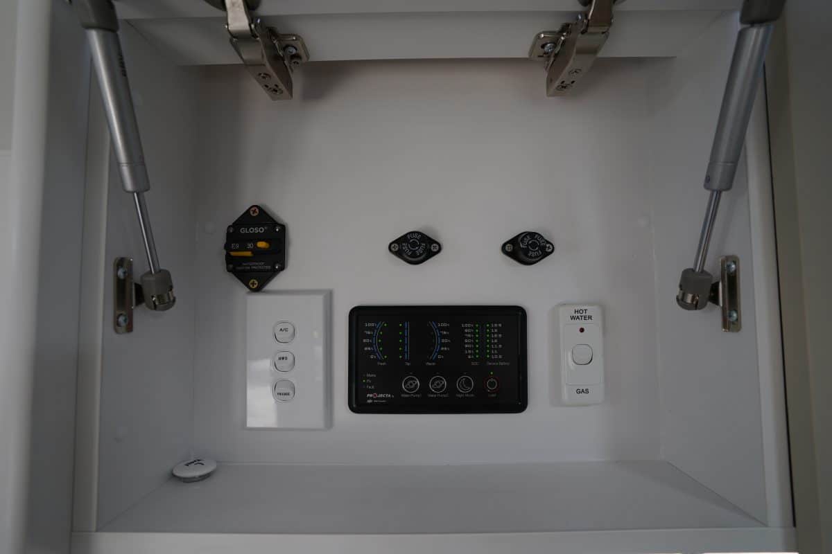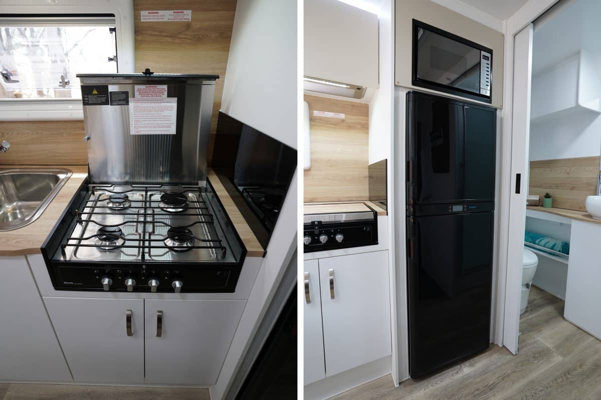 Practicality extends to the powered comforts which include the air-conditioner, a 170L compressor fridge and a microwave built into the cabinetry, while four hobs (four gas) enable practical and efficient cooking on and off-the-grid.