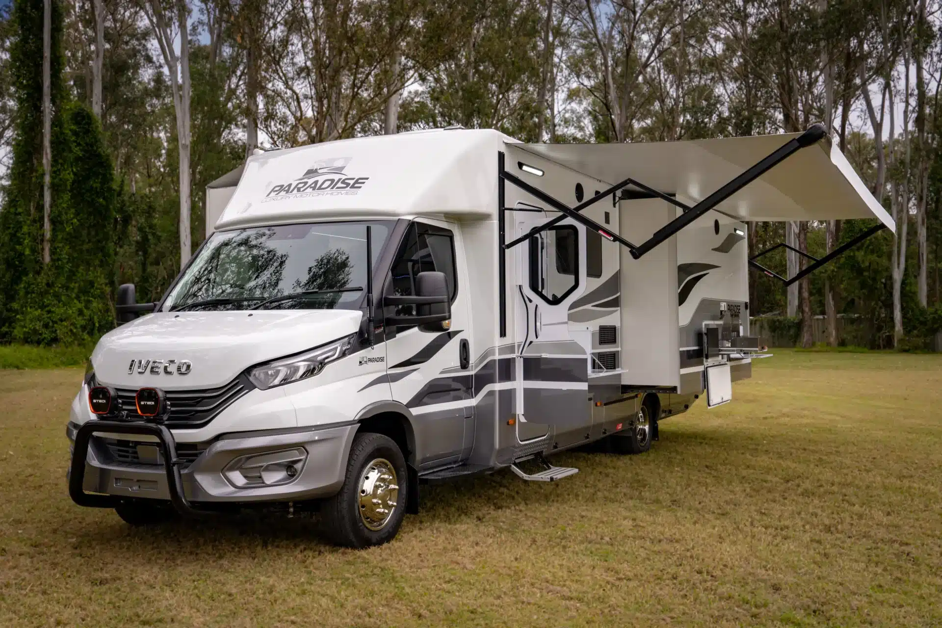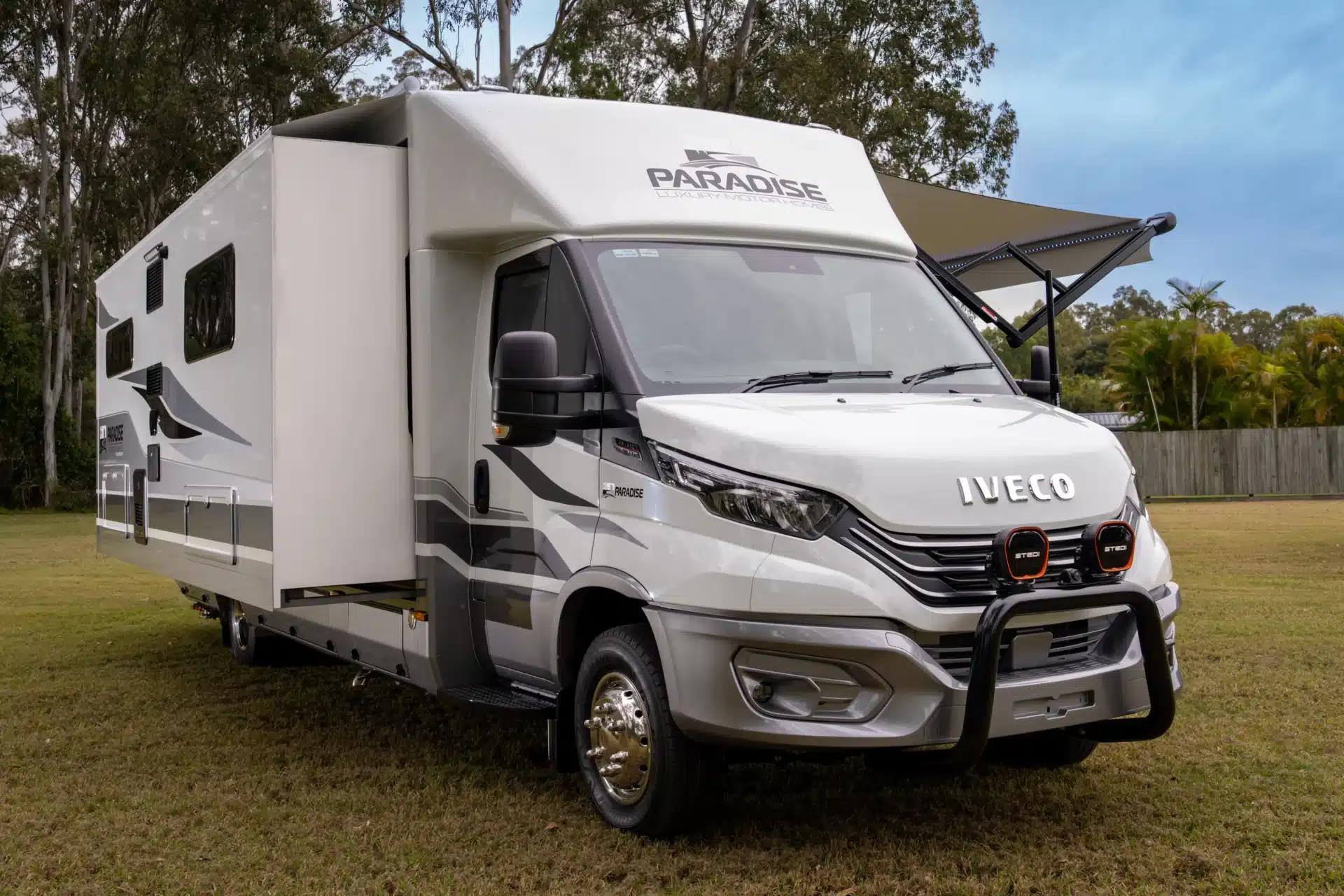 Paradise builds the Platinum on the Iveco Daily 72C210 platform and uses a dual slide-out design to expand the internal living width to approximately 3.4 metres at camp. As a result, the interior feels closer to an apartment than a traditional motorhome. In addition, the combination of a substantial off-grid power system, large water capacities and genuine towing capability appeals to travellers who want extended independence without giving up comfort.